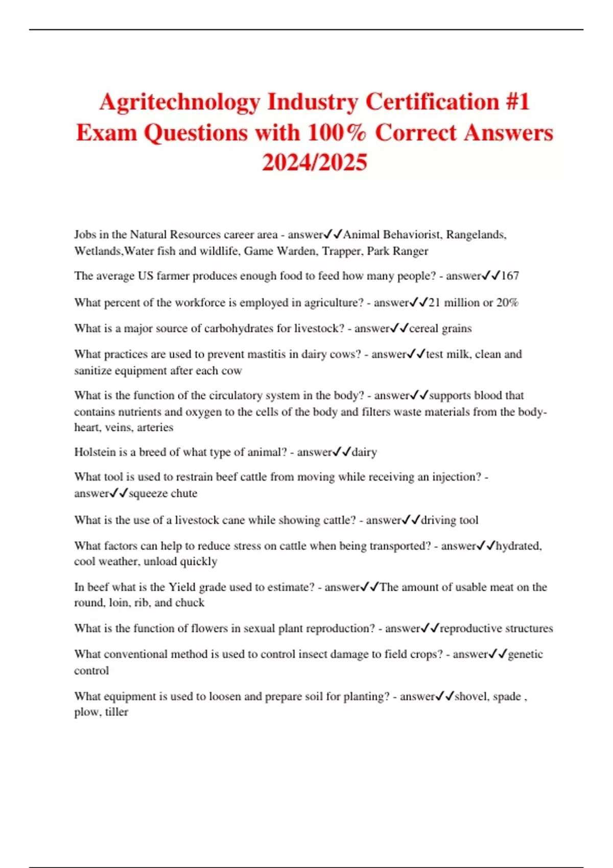 Agritechnology Industry Certification #1 Exam Questions with 100% Correct Answers 2024/2025 Jobs in the Natural Resources career area - answerAnimal Behaviorist, Rangelands, Wetlands,Water fish and wildlife, Game Warden, Trapper, Park Ranger The average US farmer produces enough food to feed how many people? - answer167 What percent of the workforce is employed in agriculture? - answer21 million or 20% What is a major source of carbohydrates for livestock? - answercereal grains What practices are used to prevent mastitis in dairy cows? - answertest milk, clean and sanitize equipment after each cow What is the function of the circulatory system in the body? - answersupports blood that contains nutrients and oxygen to the cells of the body and filters waste materials from the body- heart, veins, arteries Holstein is a breed of what type of animal? - answerdairy What tool is used to restrain beef cattle from moving while receiving an injection? - answersqueeze chute What is the use of a livestock cane while showing cattle? - answerdriving tool What factors can help to reduce stress on cattle when being transported? - answerhydrated, cool weather, unload quickly In beef what is the Yield grade used to estimate? - answerThe amount of usable meat on the round, loin, rib, and chuck What is the function of flowers in sexual plant reproduction? - answerreproductive structures What conventional method is used to control insect damage to field crops? - answergenetic control What equipment is used to loosen and prepare soil for planting? - answershovel, spade , plow, tiller