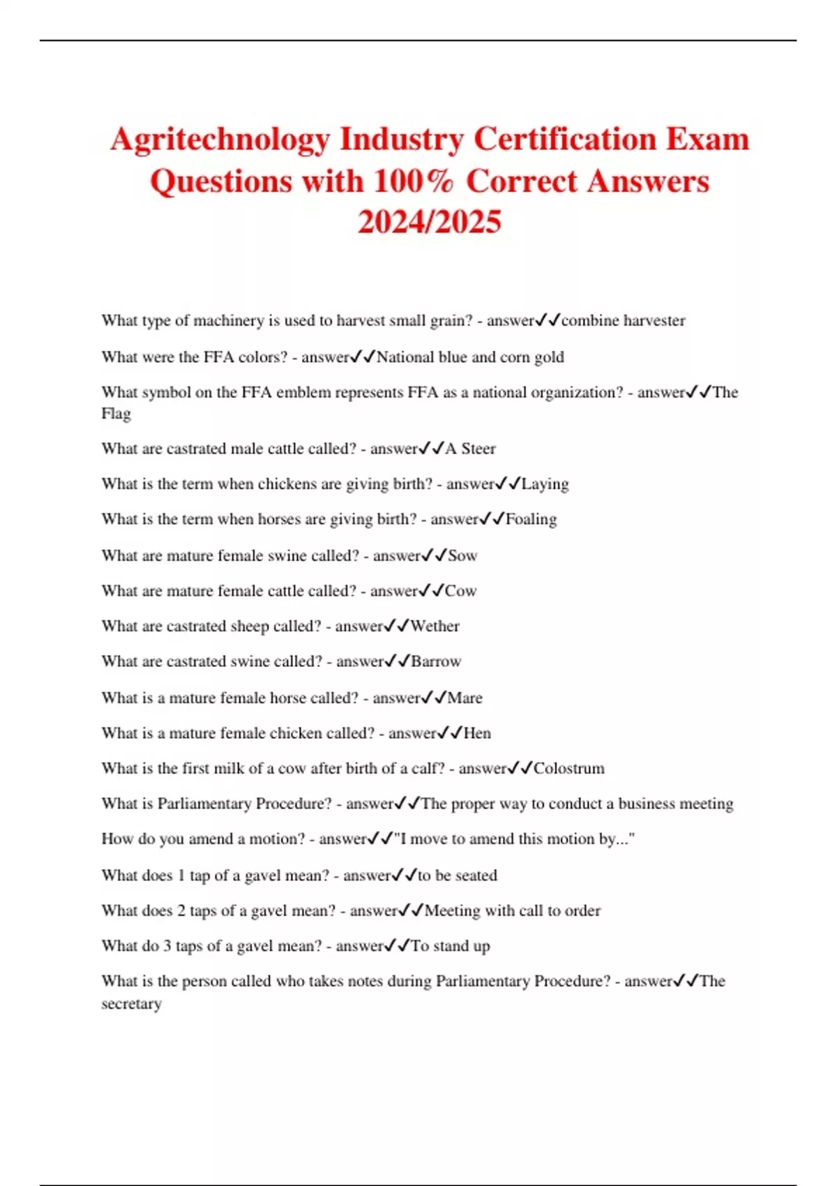Agritechnology Industry Certification Exam Questions with 100% Correct Answers 2024/2025 What type of machinery is used to harvest small grain? - answercombine harvester What were the FFA colors? - answerNational blue and corn gold What symbol on the FFA emblem represents FFA as a national organization? - answerThe Flag What are castrated male cattle called? - answerA Steer What is the term when chickens are giving birth? - answerLaying What is the term when horses are giving birth? - answerFoaling What are mature female swine called? - answerSow What are mature female cattle called? - answerCow What are castrated sheep called? - answerWether What are castrated swine called? - answerBarrow What is a mature female horse called? - answerMare What is a mature female chicken called? - answerHen What is the first milk of a cow after birth of a calf? - answerColostrum What is Parliamentary Procedure? - answerThe proper way to conduct a business meeting How do you amend a motion? - answer"I move to amend this motion by..." What does 1 tap of a gavel mean? - answerto be seated What does 2 taps of a gavel mean? - answerMeeting with call to order What do 3 taps of a gavel mean? - answerTo stand up What is the person called who takes notes during Parliamentary Procedure? - answerThe secretary