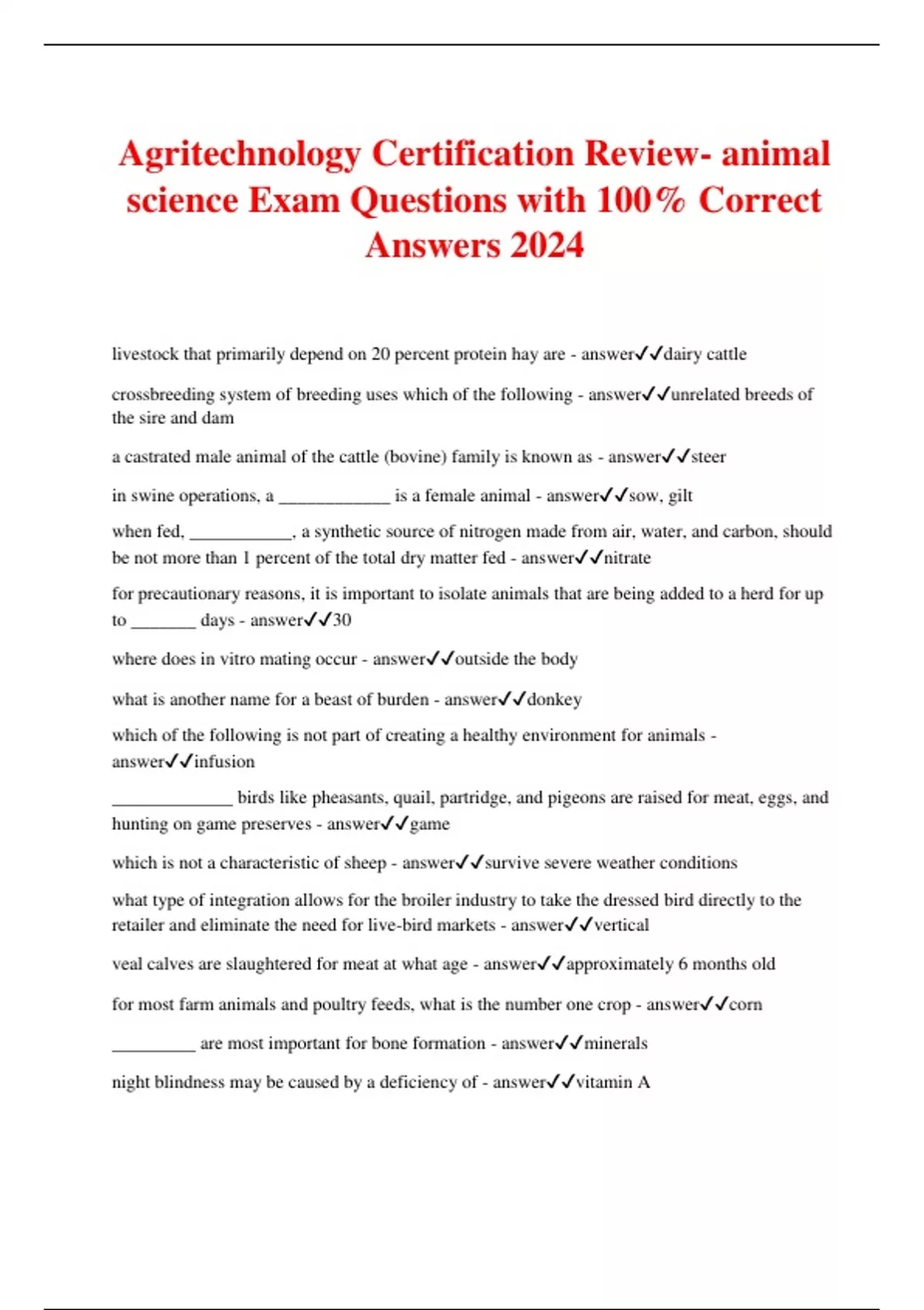 Agritechnology Certification Review- animal science Exam Questions with 100% Correct Answers 2024