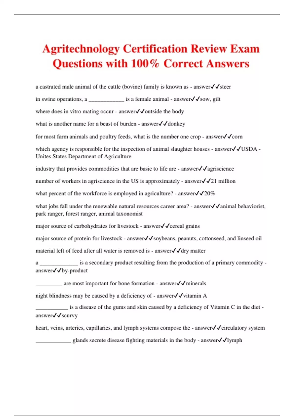 Agritechnology Certification Review Exam Questions with 100% Correct Answers a castrated male animal of the cattle (bovine) family is known as - answersteer in swine operations, a ____________ is a female animal - answersow, gilt where does in vitro mating occur - answeroutside the body what is another name for a beast of burden - answerdonkey for most farm animals and poultry feeds, what is the number one crop - answercorn which agency is responsible for the inspection of animal slaughter houses - answerUSDA - Unites States Department of Agriculture industry that provides commodities that are basic to life are - answeragriscience number of workers in agriscience in the US is approximately - answer21 million what percent of the workforce is employed in agriculture? - answer20% what jobs fall under the renewable natural resources career area? - answeranimal behaviorist, park ranger, forest ranger, animal taxonomist major source of carbohydrates for livestock - answercereal grains major source of protein for livestock - answersoybeans, peanuts, cottonseed, and linseed oil material left of feed after all water is removed is - answerdry matter a _____________ is a secondary product resulting from the production of a primary commodity - answerby-product _________ are most important for bone formation - answerminerals night blindness may be caused by a deficiency of - answervitamin A ___________ is a disease of the gums and skin caused by a deficiency of Vitamin C in the diet - answerscurvy heart, veins, arteries, capillaries, and lymph systems compose the - answercirculatory system ____________ glands secrete disease fighting materials in the body - answerlymph