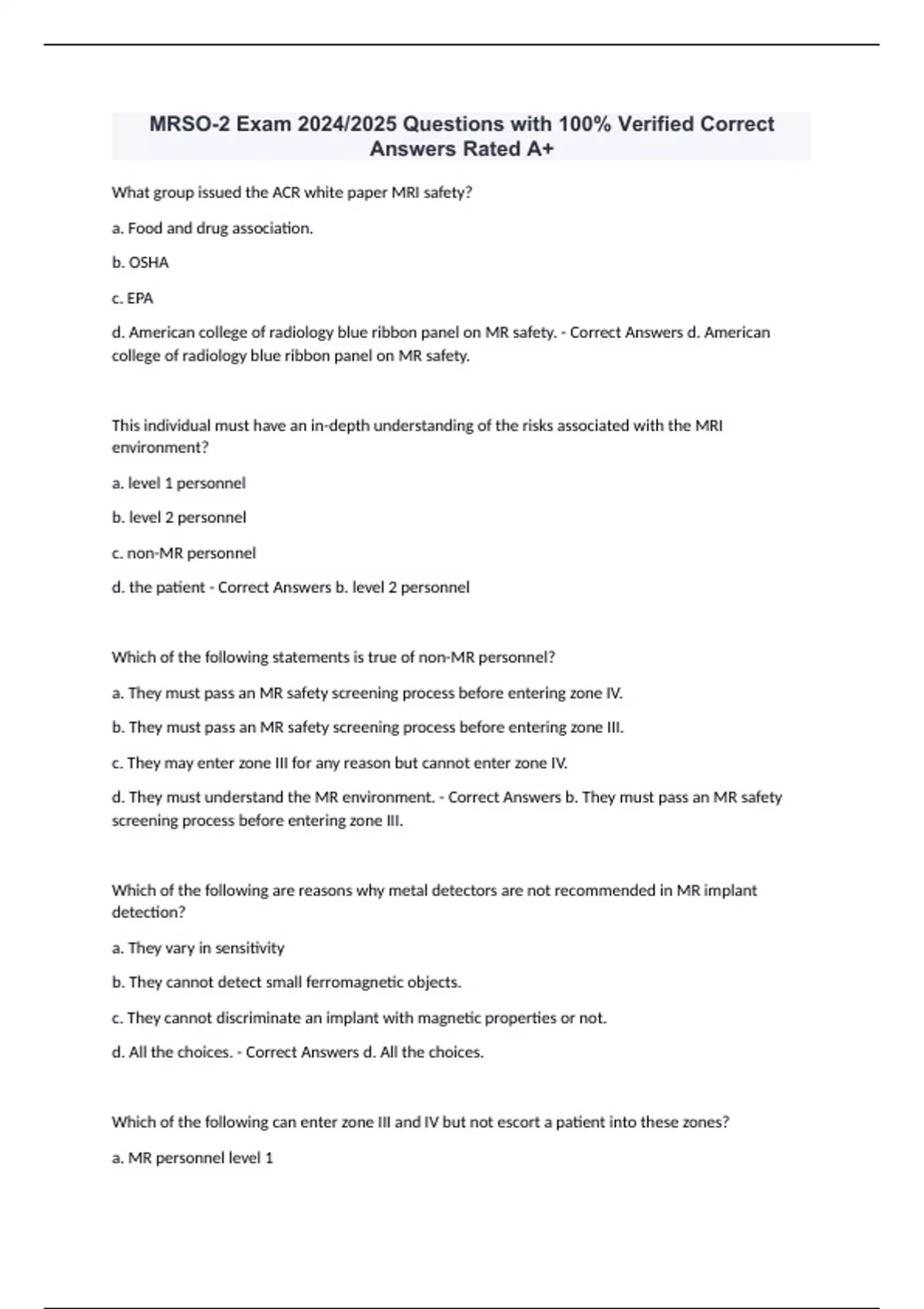 MRSO-2 Exam 2024/2025 Questions with 100% Verified Correct Answers Rated A+ What group issued the ACR white paper MRI safety? a. Food and drug association. b. OSHA c. EPA d. American college of radiology blue ribbon panel on MR safety. - Correct Answers d. American college of radiology blue ribbon panel on MR safety. This individual must have an in-depth understanding of the risks associated with the MRI environment? a. level 1 personnel b. level 2 personnel c. non-MR personnel d. the patient - Correct Answers b. level 2 personnel Which of the following statements is true of non-MR personnel? a. They must pass an MR safety screening process before entering zone IV. b. They must pass an MR safety screening process before entering zone III. c. They may enter zone III for any reason but cannot enter zone IV. d. They must understand the MR environment. - Correct Answers b. They must pass an MR safety screening process before entering zone III. Which of the following are reasons why metal detectors are not recommended in MR implant detection? a. They vary in sensitivity b. They cannot detect small ferromagnetic objects. c. They cannot discriminate an implant with magnetic properties or not. d. All the choices. - Correct Answers d. All the choices. Which of the following can enter zone III and IV but not escort a patient into these zones? a. MR personnel level 1 b. MR personnel level 2 c. Non-MR personnel d. Patient - Correct Answers a. MR personnel level 1