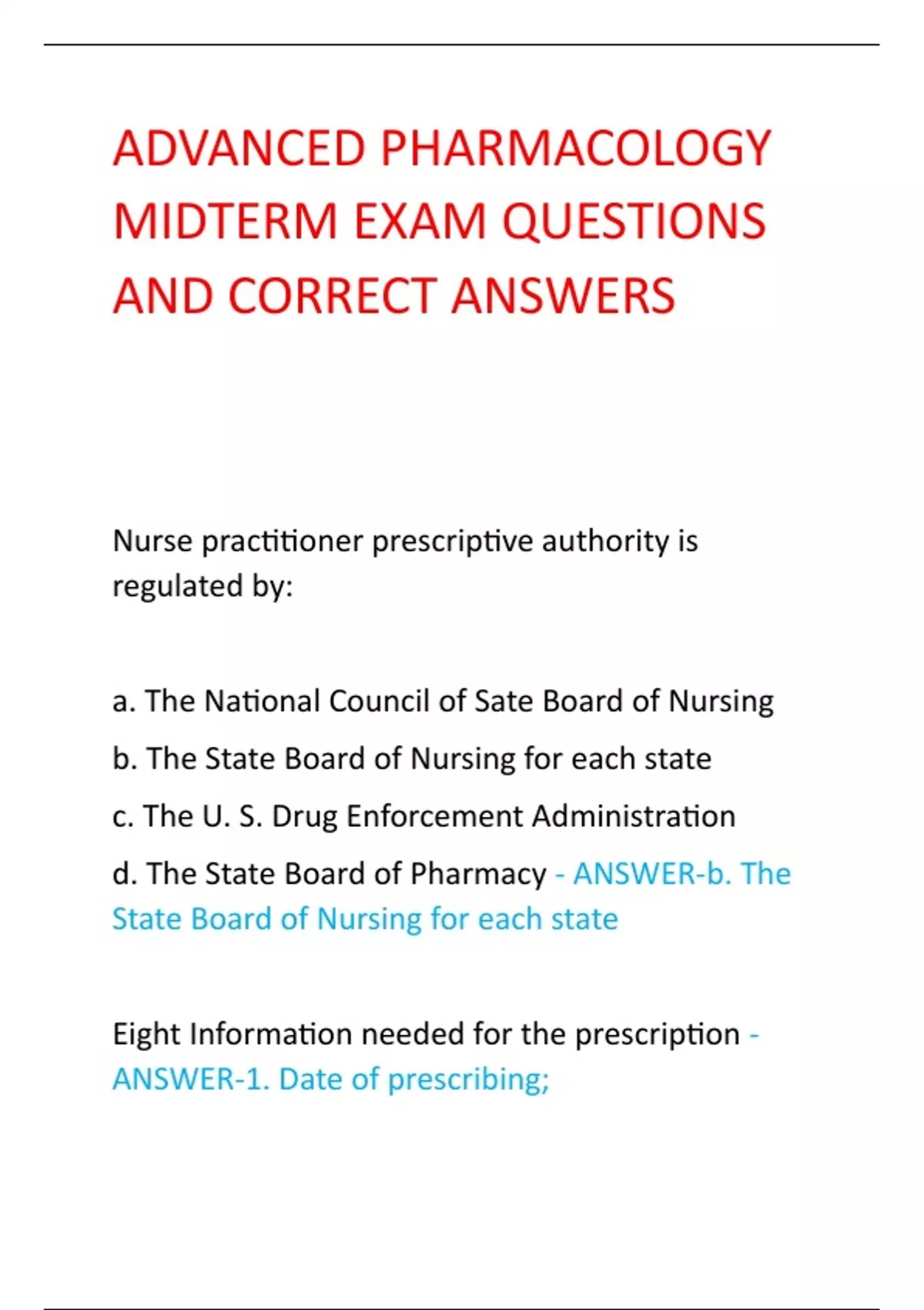 ADVANCED PHARMACOLOGY MIDTERM EXAM QUESTIONS AND CORRECT ANSWERS