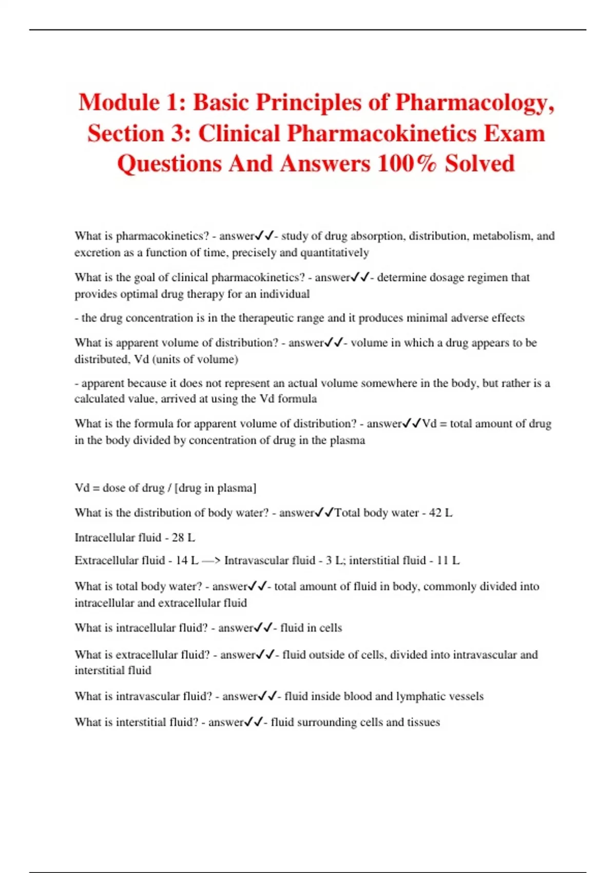 Module 1: Basic Principles of Pharmacology, Section 3: Clinical Pharmacokinetics Exam Questions And Answers 100% Solved What is pharmacokinetics? - answer- study of drug absorption, distribution, metabolism, and excretion as a function of time, precisely and quantitatively What is the goal of clinical pharmacokinetics? - answer- determine dosage regimen that provides optimal drug therapy for an individual - the drug concentration is in the therapeutic range and it produces minimal adverse effects What is apparent volume of distribution? - answer- volume in which a drug appears to be distributed, Vd (units of volume) - apparent because it does not represent an actual volume somewhere in the body, but rather is a calculated value, arrived at using the Vd formula What is the formula for apparent volume of distribution? - answerVd = total amount of drug in the body divided by concentration of drug in the plasma Vd = dose of drug / [drug in plasma] What is the distribution of body water? - answerTotal body water - 42 L Intracellular fluid - 28 L Extracellular fluid - 14 L —> Intravascular fluid - 3 L; interstitial fluid - 11 L What is total body water? - answer- total amount of fluid in body, commonly divided into intracellular and extracellular fluid What is intracellular fluid? - answer- fluid in cells What is extracellular fluid? - answer- fluid outside of cells, divided into intravascular and interstitial fluid What is intravascular fluid? - answer- fluid inside blood and lymphatic vessels What is interstitial fluid? - answer- fluid surrounding cells and tissues