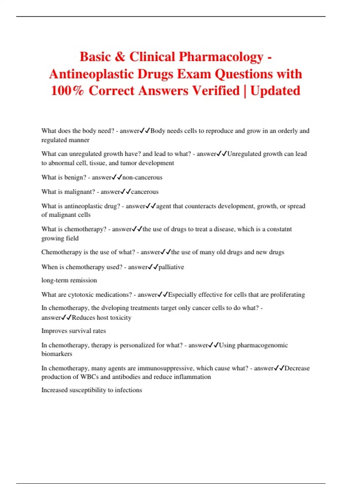 Basic & Clinical Pharmacology - Antineoplastic Drugs Exam Questions with 100% Correct Answers Verified | Updated