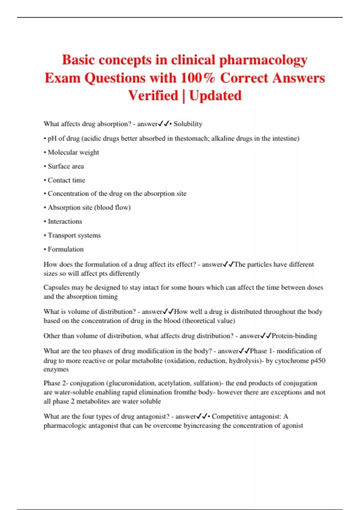 Basic concepts in clinical pharmacology Exam Questions with 100% Correct Answers Verified | Updated What affects drug absorption? - answer• Solubility • pH of drug (acidic drugs better absorbed in thestomach; alkaline drugs in the intestine) • Molecular weight • Surface area • Contact time • Concentration of the drug on the absorption site • Absorption site (blood flow) • Interactions • Transport systems • Formulation How does the formulation of a drug affect its effect? - answerThe particles have different sizes so will affect pts differently Capsules may be designed to stay intact for some hours which can affect the time between doses and the absorption timing What is volume of distribution? - answerHow well a drug is distributed throughout the body based on the concentration of drug in the blood