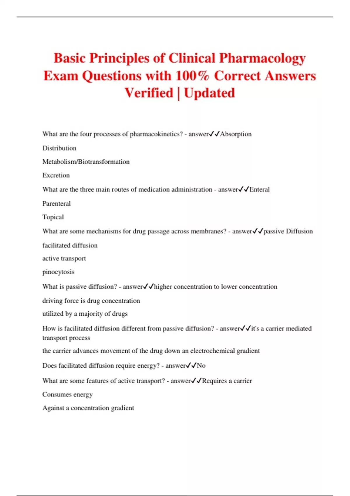 Basic Principles of Clinical Pharmacology Exam Questions with 100% Correct Answers Verified | Updated What are the four processes of pharmacokinetics? - answerAbsorption Distribution Metabolism/Biotransformation Excretion What are the three main routes of medication administration - answerEnteral Parenteral Topical What are some mechanisms for drug passage across membranes? - answerpassive Diffusion facilitated diffusion active transport pinocytosis What is passive diffusion? - answerhigher concentration to lower concentration driving force is drug concentration utilized by a majority of drugs How is facilitated diffusion different from passive diffusion? - answerit's a carrier mediated transport process the carrier advances movement of the drug down an electrochemical gradient Does facilitated diffusion require energy? - answerNo What are some features of active transport? - answerRequires a carrier Consumes energy Against a concentration gradient