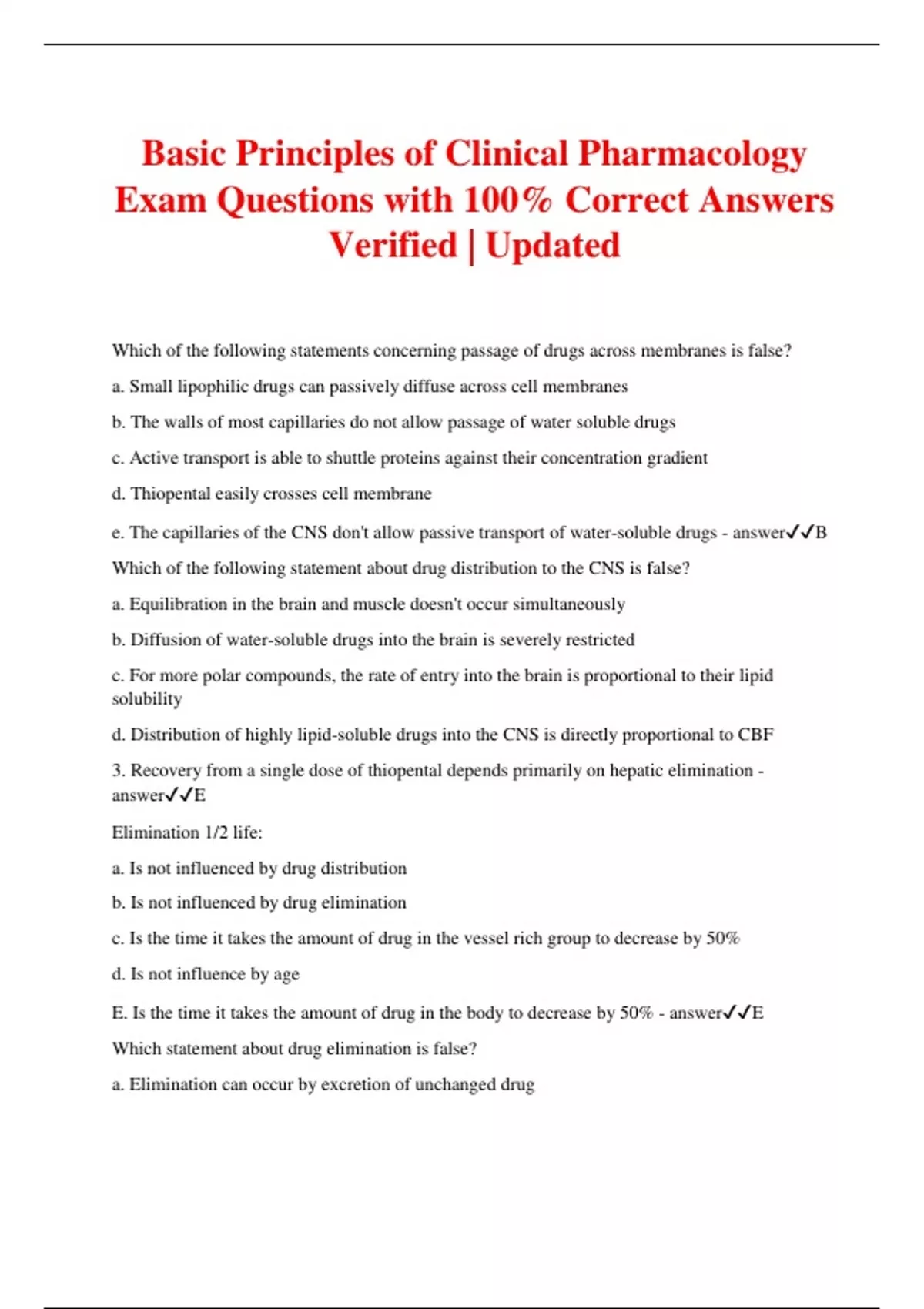 Basic Principles of Clinical Pharmacology Exam Questions with 100% Correct Answers Verified | Updated Which of the following statements concerning passage of drugs across membranes is false? a. Small lipophilic drugs can passively diffuse across cell membranes b. The walls of most capillaries do not allow passage of water soluble drugs c. Active transport is able to shuttle proteins against their concentration gradient d. Thiopental easily crosses cell membrane e. The capillaries of the CNS don't allow passive transport of water-soluble drugs - answerB Which of the following statement about drug distribution to the CNS is false? a. Equilibration in the brain and muscle doesn't occur simultaneously b. Diffusion of water-soluble drugs into the brain is severely restricted c. For more polar compounds, the rate of entry into the brain is proportional to their lipid solubility d. Distribution of highly lipid-soluble drugs into the CNS is directly proportional to CBF 3. Recovery from a single dose of thiopental depends primarily on hepatic elimination - answerE Elimination 1/2 life: a. Is not influenced by drug distribution b. Is not influenced by drug elimination c. Is the time it takes the amount of drug in the vessel rich group to decrease by 50% d. Is not influence by age E. Is the time it takes the amount of drug in the body to decrease by 50% - answerE Which statement about drug elimination is false? a. Elimination can occur by excretion of unchanged drug
