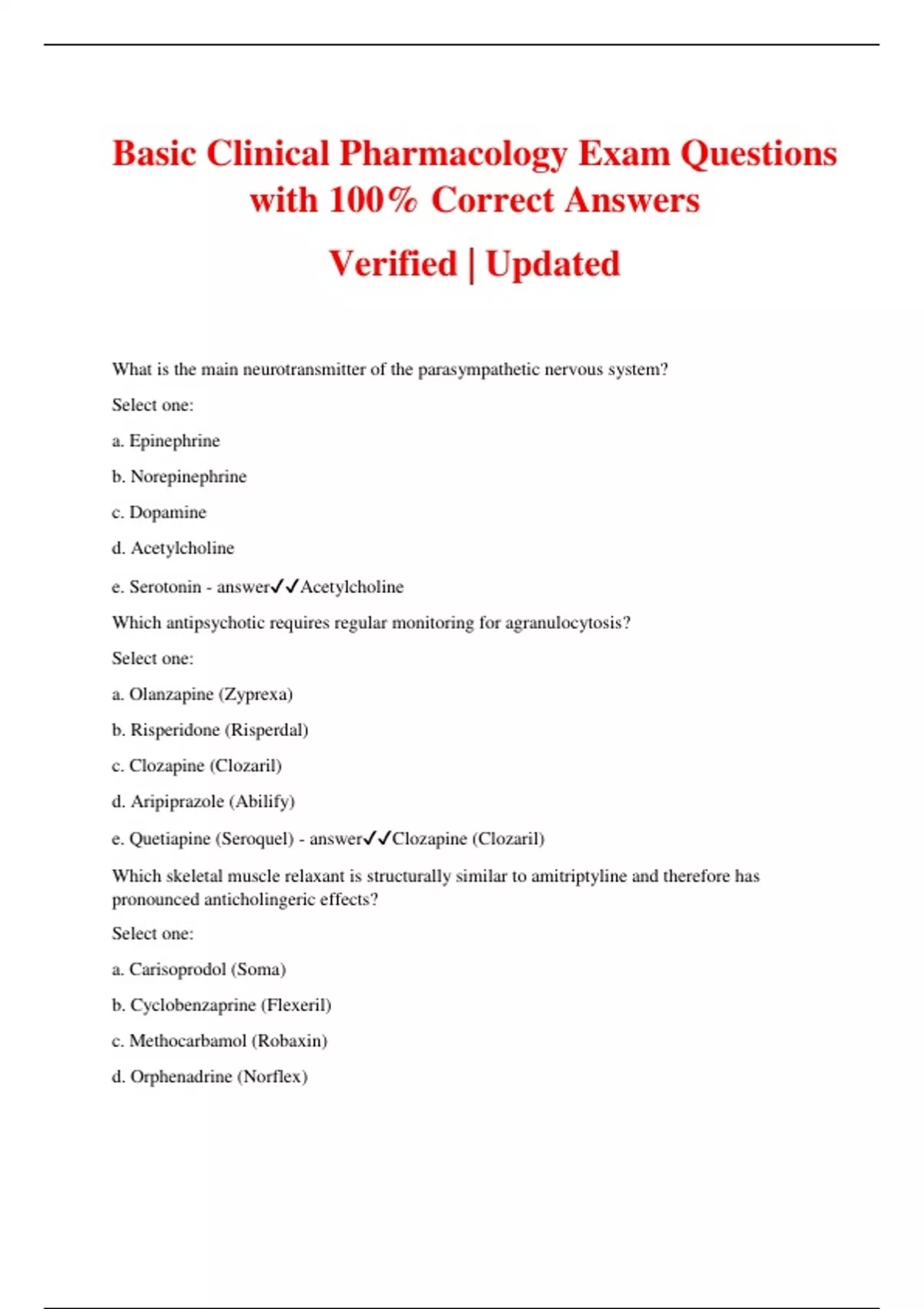 Basic Clinical Pharmacology Exam Questions with 100% Correct Answers Verified | Updated What is the main neurotransmitter of the parasympathetic nervous system? Select one: a. Epinephrine b. Norepinephrine c. Dopamine d. Acetylcholine e. Serotonin - answerAcetylcholine Which antipsychotic requires regular monitoring for agranulocytosis? Select one: a. Olanzapine (Zyprexa) b. Risperidone (Risperdal) c. Clozapine (Clozaril) d. Aripiprazole (Abilify) e. Quetiapine (Seroquel) - answerClozapine (Clozaril) Which skeletal muscle relaxant is structurally similar to amitriptyline and therefore has pronounced anticholingeric effects? Select one: a. Carisoprodol (Soma) b. Cyclobenzaprine (Flexeril) c. Methocarbamol (Robaxin) d. Orphenadrine (Norflex) e. Tizanidine (Zanaflex) - answerCyclobenzaprine (Flexeril) Beta-blockers may be clinically useful in the treatment of: Select one: a. Hypertension b. Cardiac dysrhythmias c. Chronic heart failure d. Both A and C e. A, B, and C - answerA, B, and C Beta-blockers have many cardiovascular clinical indications, including the treatment of hypertension, cardiac dysrhythmias, and chronic heart failure. In each case the slowing of the pumping of the heart is key in bringing about the therapeutic benefit. How is ramelteon (Rozerem) different from Z-drugs? When might it be advantageous? - answerRamelteon is a melatonin receptor agonist and has no direct effects on GABA. It affects sleep latency (reducing the amount of time it takes to fall asleep). It is not a controlled substance and abuse potential is low. It might be especially good for people suffering from jet- lag. List 2 non-cardiac indications for beta-blockers. - answerMigraine headaches and anxiety. Beta-blockers may also be used in the management of essential tremor and as migraine prophylactic agents. They may also be used for stage fright or in hyperthyroidism. Briefly describe the concept of "therapeutic index." What does it mean and how does it relate to the safety and efficacy of the drug in question? - answerTherapeutic index refers to the difference in dose required to achieve a clinical effect and a toxic effect. If only small doses are required for a clinical effect and very large doses are needed before a drug becomes toxic, then that drug is said to have a wide therapeutic index -- a little is helpful and it takes a lot to be harmful. A narrow therapeutic index drug would be like cancer chemotherapy where the dose that is efficacious is near the same dose that is toxic. Which of the following drugs used for asthma and allergic rhinitis has a black box warning from the FDA regarding serious mental health-related side effects? Select one: a. Albuterol (Ventolin) b. Theophylline (Theo-Dur) c. Fluticasone (Flovent) d. Montelukast (Singulair) e. Chlorpheniramine (Chlor-Trimeton) - answerMontelukast (Singulair) Which of the following is NOT considered to be both an antiepileptic drug as well as a mood stabilizer? Select one: a. Valproic acid (Depakote) b. Lamotrigine (Lamictal) c. Carbamazepine (Tegretol) d. Pregabalin (Lyrica) e. Topiramate (Topamax) - answerPregabalin (Lyrica) What is myasthenia gravis, what type of drug is used to treat it, and how do they work? - answerMyasthenia gravis is a rare autoimmune condition affecting the neuromuscular junction of skeletal muscles. It is characterized by drooping eyelid, double vision, and generalized muscle weakness. It is treated with acetylcholinesterase inhibitors, such as pyridostigmine to increase cholinergic activity at the motor end plate. Which of the following is a selective serotonin reuptake inhibitor (SSRI)? Select one: a. Duloxetine (Cymbalta) b. Venlafaxine (Effexor) c. Bupropion (Wellbutrin) d. Escitalopram (Lexapro) e. Mirtazapine (Remeron) - answerEscitalopram (Lexapro) A dry, hacking cough is a common adverse effect of: Select one: a. Propranolol (Inderal) b. Enalapril (Vasotec) c. Losartan (Cozaar) d. Amlodipine (Norvasc) e. Diltiazem (Cardizem) - answerEnalapril (Vasotec) What are the 4 main pharmacokinetic processes? (and give a one line definition of each) - answerAbsorption -how drugs get into the body through different routes