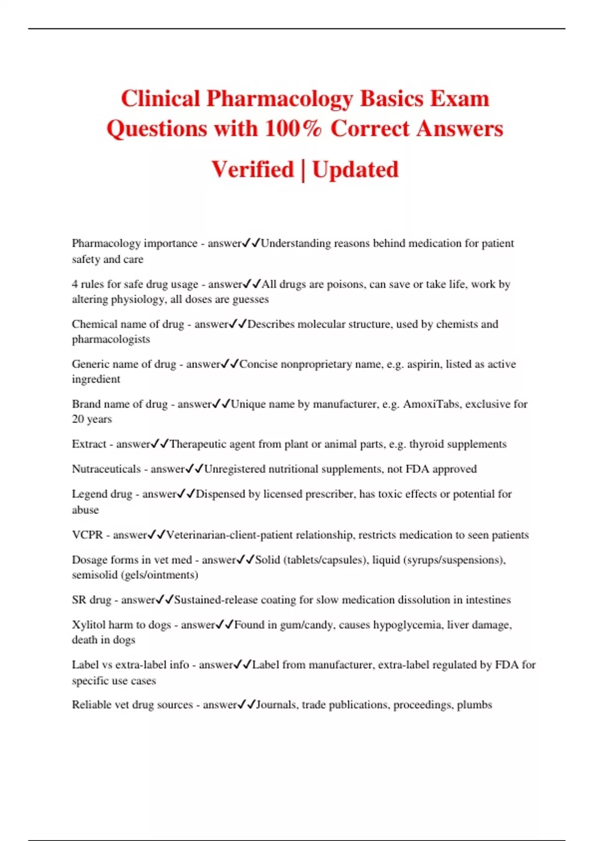 Clinical Pharmacology Basics Exam Questions with 100% Correct Answers Verified | Updated Pharmacology importance - answerUnderstanding reasons behind medication for patient safety and care 4 rules for safe drug usage - answerAll drugs are poisons, can save or take life, work by altering physiology, all doses are guesses Chemical name of drug - answerDescribes molecular structure, used by chemists and pharmacologists Generic name of drug - answerConcise nonproprietary name, e.g. aspirin, listed as active ingredient Brand name of drug - answerUnique name by manufacturer, e.g. AmoxiTabs, exclusive for 20 years Extract - answerTherapeutic agent from plant or animal parts, e.g. thyroid supplements Nutraceuticals - answerUnregistered nutritional supplements, not FDA approved Legend drug - answerDispensed by licensed prescriber, has toxic effects or potential for abuse