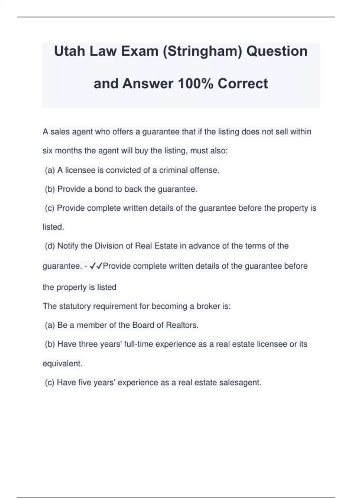 Utah Law Exam (Stringham) Question and Answer 100% Correct A sales agent who offers a guarantee that if the listing does not sell within six months the agent will buy the listing, must also: (a) A licensee is convicted of a criminal offense. (b) Provide a bond to back the guarantee. (c) Provide complete written details of the guarantee before the property is listed. (d) Notify the Division of Real Estate in advance of the terms of the guarantee. - Provide complete written details of the guarantee before the property is listed The statutory requirement for becoming a broker is: (a) Be a member of the Board of Realtors. (b) Have three years' full-time experience as a real estate licensee or its equivalent. (c) Have five years' experience as a real estate salesagent.