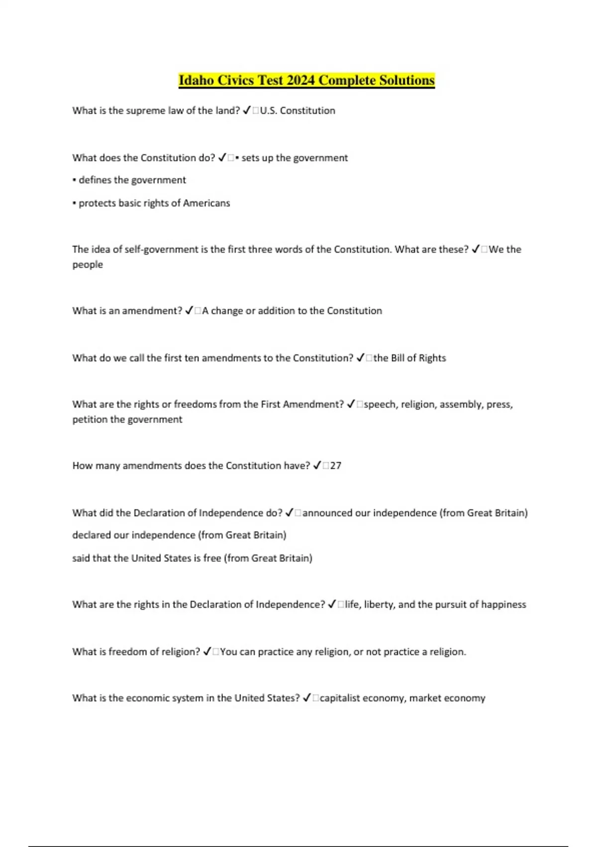 Idaho Civics Test 2024 Complete Solutions What is the supreme law of the land? ️U.S. Constitution What does the Constitution do? ️▪ sets up the government ▪ defines the government ▪ protects basic rights of Americans The idea of self-government is the first three words of the Constitution. What are these? ️We the people What is an amendment? ️A change or addition to the Constitution What do we call the first ten amendments to the Constitution? ️the Bill of Rights What are the rights or freedoms from the First Amendment? ️speech, religion, assembly, press, petition the government How many amendments does the Constitution have? ️27 What did the Declaration of Independence do? ️announced our independence (from Great Britain) declared our independence (from Great Britain) said that the United States is free (from Great Britain) What are the rights in the Declaration of Independence? ️life, liberty, and the pursuit of happiness What is freedom of religion? ️You can practice any religion, or not practice a religion. What is the economic system in the United States? ️capitalist economy, market economy What is the "rule of law"? ️Everyone must follow the law. Leaders must obey the law. Government must obey the law. No one is above the law. What are the branches of government? ️Legislative, Executive, Judicial What stops one branch of government from becoming too powerful? ️checks and balances; separation of powers Who is in charge of the executive branch? ️the President Who makes federal laws? ️Congress What are the two parts of Congress? ️Senate and House of Representatives How many U.S. Senators are there? ️100 We elect a U.S. Senator for how many years? ️6 years What are your state's U.S. Senators right now? ️James E Risch and Mike Crapo The House of Representatives has how many voting members? ️435 We elect a U.S. Representative for how many years? ️2 years What is your U.S. Representative? ️Mike K. Simpson