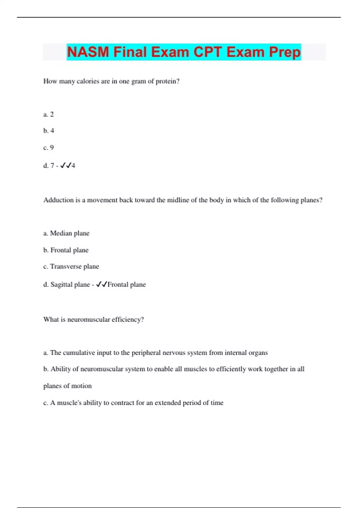 NASM Final Exam CPT Exam Prep How many calories are in one gram of protein? a. 2 b. 4 c. 9 d. 7 - 4 Adduction is a movement back toward the midline of the body in which of the following planes? a. Median plane b. Frontal plane c. Transverse plane d. Sagittal plane - Frontal plane What is neuromuscular efficiency? a. The cumulative input to the peripheral nervous system from internal organs b. Ability of neuromuscular system to enable all muscles to efficiently work together in all planes of motion c. A muscle's ability to contract for an extended period of time d. Ability of the body's stabilizing muscles to provide force for movement - Ability of neuromuscular system to enable all muscles to efficiently work together in all planes of motion What term refers to a bending movement in which the relative angle between two adjacent segments decreases? Select one: a. Eversion b. Flexion c. Evulsion d. Abduction - Flexion Which of the following represents the pressure within the arterial system when the heart is resting and filling with blood? a. Medial b. Systolic c. Distal d. Diastolic - Diastolic In which plane of motion does a hammer curl occur? a. Anterior-posterior b. Frontal c. Sagittal d. Transverse - Sagittal Which term refers to the amount of blood pumped out of the heart with each contraction? a. Radial pulse b. Stroke volume c. Heart rate d. Cardiac output - Stroke volume How does metabolism behave during EPOC?