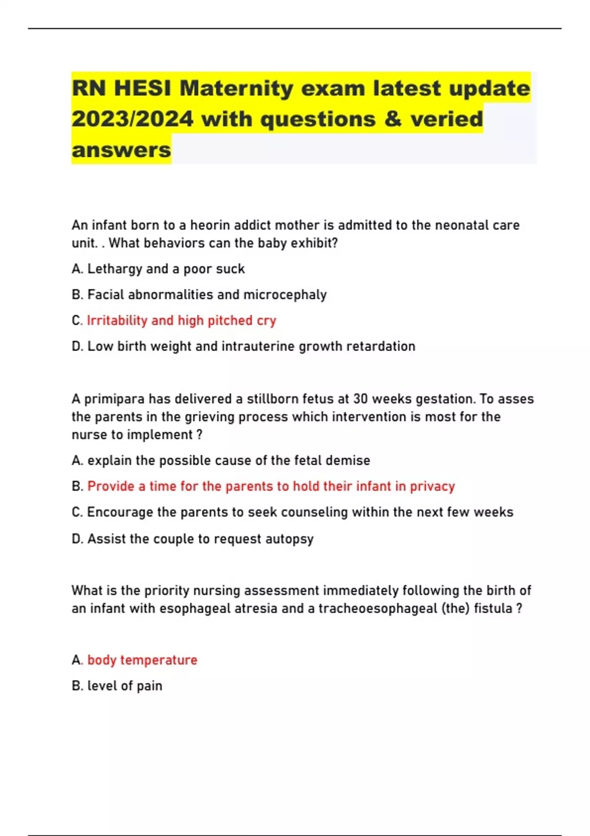 RN HESI Maternity exam latest update 2023/2024 with questions & veried answers An infant born to a heorin addict mother is admitted to the neonatal care unit. . What behaviors can the baby exhibit? A. Lethargy and a poor suck B. Facial abnormalities and microcephaly C. Irritability and high pitched cry D. Low birth weight and intrauterine growth retardation A primipara has delivered a stillborn fetus at 30 weeks gestation. To asses the parents in the grieving process which intervention is most for the nurse to implement ? A. explain the possible cause of the fetal demise B. Provide a time for the parents to hold their infant in privacy C. Encourage the parents to seek counseling within the next few weeks D. Assist the couple to request autopsy What is the priority nursing assessment immediately following the birth of an infant with esophageal atresia and a tracheoesophageal (the) fistula ? A. body temperature B. level of pain C. time of first void D. number of vessels in the cord What is the most important assessment for the nurse to conduct following the administration of epidural anesthesia to a client who is at 40-weeks gestation? A. Level of pain sensation B. Station of presenting part C. Variability of fetal heart rate D. Maternal blood pressure The parents of a male newborn have signed an informed consent for circumcision. What priority intervention should the nurse implement upon completion of the circumcision? A. Offer a pacifier dipped in glucose water. B. Give PRN dose of liquid acetaminophen. C. Place petrolatum gauze dressing on the site. D. Wrap the infant in warm receiving blankets. While caring for a laboring client on continuous fetal monitoring, the nurse notes a fetal heart rate pattern that falls and rises abruptly with a "V" shaped appearance. What action should the nurse take first? A. Prepare for a potential cesarean B. Allow the client to begin pushing C. Administer oxygen at 10/L by mask D. Change the maternal position - A 34-week primigravida with pregnancy induced hypertension (PIH) is receiving Ringer's Lactate 500 ml with magnesium sulfate 20 grams at the rate of 3 grams/hour. How many ml/hour should the nurse program the infusion pump? (Enter numeric value only) A. 120 B. 70 C. 65 D. 75 A mother of a 3-year-old boy has just given birth to a new baby girl. The little boy asks the nurse, "Why is my baby sister eating my mommy's breast?" How should the nurse respond? (Select all that apply) A. Explain that newborns get milk from their mothers in this way B. Reassure the older brother that it does not hurt his mother C. Remind him that his mother breastfed him too D. Suggest that the baby can also drink from a bottle E. Clarify that breastfeeding is his mother's choice The nurse is examining an infant for possible cryptorchidism. Which exam technique should be used? A. Place the infant in side-lying to facilitate the exam B. Hold the penis and retract the foreskin gently C. Cleanse the penis with an antiseptic-soaked pad D. Place the infant in warm room and use a calm approach