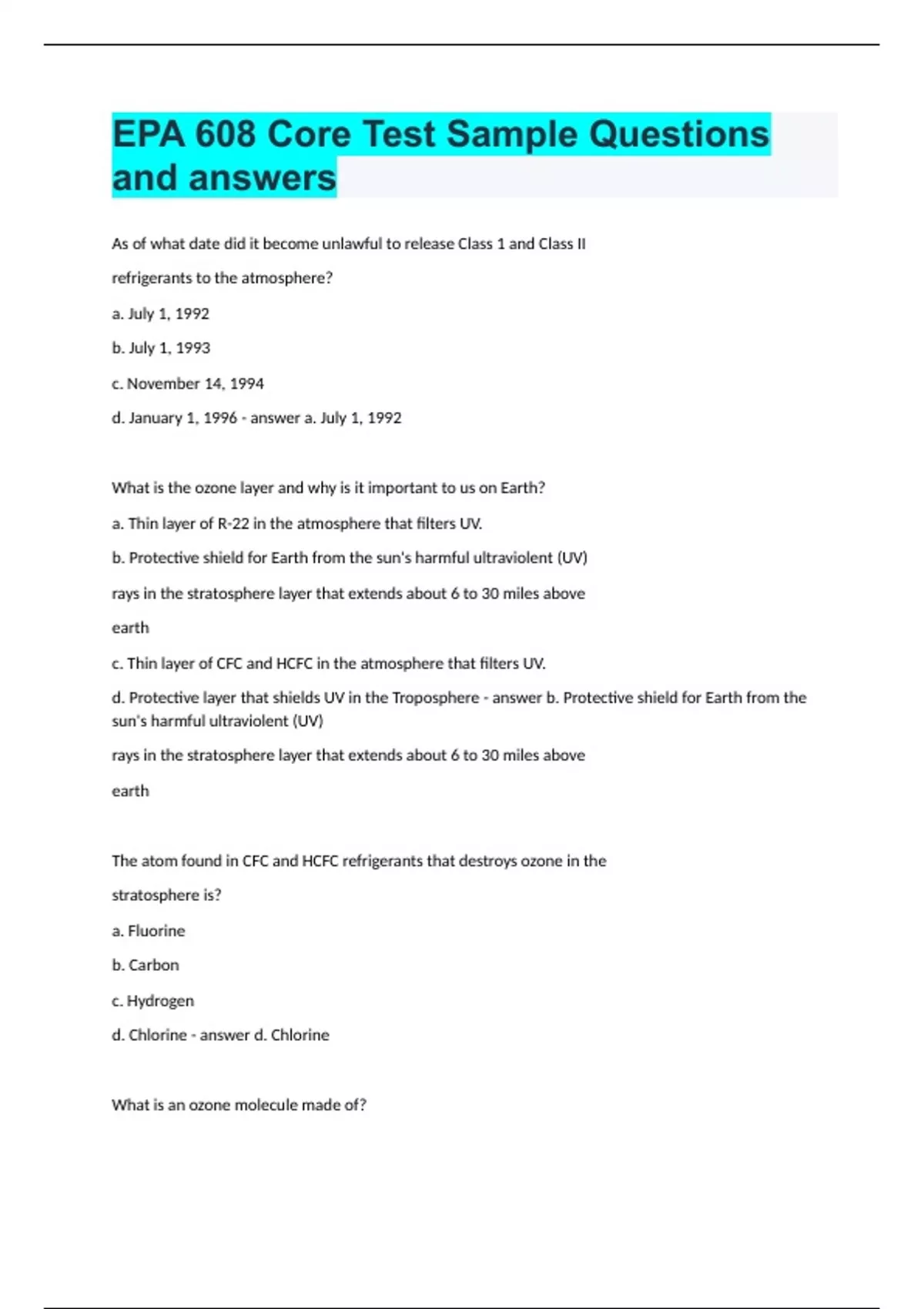As of what date did it become unlawful to release Class 1 and Class II refrigerants to the atmosphere? a. July 1, 1992 b. July 1, 1993 c. November 14, 1994 d. January 1, 1996 a. July 1, 1992 What is the ozone layer and why is it important to us on Earth? a. Thin layer of R-22 in the atmosphere that filters UV. b. Protective shield for Earth from the sun's harmful ultraviolent (UV) rays in the stratosphere layer that extends about 6 to 30 miles above earth c. Thin layer of CFC and HCFC in the atmosphere that filters UV. d. Protective layer that shields UV in the Troposphere b. Protective shield for Earth from the sun's harmful ultraviolent (UV) rays in the stratosphere layer that extends about 6 to 30 miles above earth The atom found in CFC and HCFC refrigerants that destroys ozone in the stratosphere is? a. Fluorine b. Carbon c. Hydrogen d. Chlorine d. Chlorine What is an ozone molecule made of? a. Refrigerant b. Ammonia c. Three oxygen atoms (O3). d. Oxygen and ammonia. Three oxygen atoms (O3). Which refrigerant is a CFC? a. R-134A b. R-123 c. R-22 d. R-12 d. R-12 What is the name of the atom that attacks ozone molecules? a. CFC atoms b. HCFC atoms c. Chlorine and bromine atoms emitted into the atmosphere d. a and b c. Chlorine and bromine atoms emitted into the atmosphere Which refrigerant is a HFC? a. R-134A b. R-123 c. R-22 d. R-12 a. R-134A Describe how one Chlorine atom can destroy 100,000 ozone molecules. a. Chlorine releases one of the oxygen atoms and forms two O2 oxygen molecules, leaving the chlorine molecule free to attack another ozone molecule and repeat the process. b. Chlorine locks up the ozone molecule and then and then goes after another. c. Chlorine converts the ozone to bromine and then attacks more ozone molecules. d. Chlorine can bleach 100,000 ozone molecules before it weakens. a. Chlorine releases one of the oxygen atoms and forms two O2 oxygen molecules, leaving the chlorine molecule free to attack another ozone molecule and repeat the process. Which refrigerant contains no chlorine? a. R-134A b. R-123 c. R-22 d. R-12 a. R-134A Name the refrigerant types that belong to CFCs, HCFCs and HFCs a. CFC R-11, R-12, R-500 b. HCFC R-22, R-123 c. HFC R-134a d. All of the above are correct d. All of the above are correct The rule of thumb for refilling approved cylinders is a maximum of ___ percent liquid? a. 60% b. 79% c. 80% d. 90% c. 80% What do the letters in "HCFC" stand for? a. High Carbon Fluorine Chlorine b. hydrochlorofluorocarbons c. Harmful Carbon Fluorine Chlorine d. highchlorinefluorocarbon b. hydrochlorofluorocarbons To recover refrigerant is to? a. Remove a refrigerant in any condition from a system in either an active or passive manner, and store it in an external container without necessarily testing or processing b. Reduce contaminants in used refrigerant by oil separation through filter dryers. c. Reprocess refrigerant to new product specifications d. Remove refrigerant and change ownership. a. Remove a refrigerant in any condition from a system in either an active or passive manner, and store it in an external container without necessarily testing or processing What is ODP? a. Oxygen Destruction Properties b. Ozone Depletion Potential c. Ozone Destruction Properties d. Oxygen Depletion Potential b. Ozone Depletion Potential R-134A is a "drop in" refrigerant for? 36 | P a g e a. R-12 b. R-22 c. R-11 d. R-134A is not a drop-in refrigerant d. R-134A is not a drop-in refrigerant Name some of the health and environmental effects of ozone depletion. a. Increased Temperature of the Earth b. Increased Cases of Skin Cancer c. Increased numbers of Cataracts in the eyes d. All the above d. All the above The condition and state of the refrigerant leaving a receiver is? a. Subcooled liquid b. Subcooled vapor c. Superheated vapor d. Superheated liquid. a. Subcooled liquid What evidence do we have that CFCs and HCFCs are depleting the ozone? a. The rise in the amount of chlorine measured in the stratosphere over the past two decades matches the rise in the amount of fluorine. b. The rise in the amount of chlorine measured in the stratosphere over the past two decades matches the rise in CFC emissions over the same period. c. Samples of air taken from the stratosphere over erupting volcanoes show that volcanoes contribute a small quantity of chlorine to the stratosphere compared to CFCs. d. All the above d. All the above The component of an air conditioning system that changes a low pressure vapor to a high pressure vapor is the? a. Condenser b. Metering device c. Evaporator d. Compressor 20.What characteristics d. Compressor What characteristics make it easy for CFCs to reach the stratosphere and how do they get there? a. CFCs are lighter than air atoms and rise into the Stratosphere. b. CFCs will not dissolve in water or break down into compounds that dissolve in water. Wind moves them into the Stratosphere c. Heating of the CFCs makes them lighter than air. d. a and c b. CFCs will not dissolve in water or break down into compounds that dissolve in water. Wind moves them into the Stratosphere Why do we now use R-134a refrigerant? a. It costs less b. HFCs do not contain any chlorine c. It is a drop in replacement for R-22 d. It is a drop in replacement for R-11 b. HFCs do not contain any chlorine What is the purpose of the CAA? 37 | P a g e a. Regulate California Air quality b. Clean the air in the US c. Limit how much of a pollutant can be in the air in the US c. Limit how much of a pollutant can be in the air in the US What three things is the CAA doing to control chlorofluorocarbon emissions? a. Set dates to phase out CFC's and HCFC's b. Prohibit venting of CFC and HCFC c. Require the EPA to set standards for recovery of refrigerants prior to appliance disposal d. All the above d. All the above What can states do in addition to the CAA? a. Enforce standards more strict than the CAA laws b. Nothing c. States can create their own laws. d. All of the above a. Enforce 