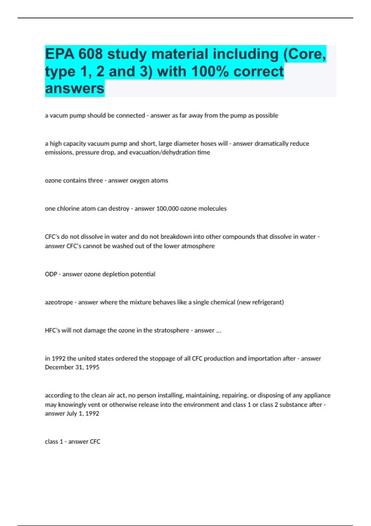 EPA 608 study material including (Core, type 1, 2 and 3) with 100% correct answers