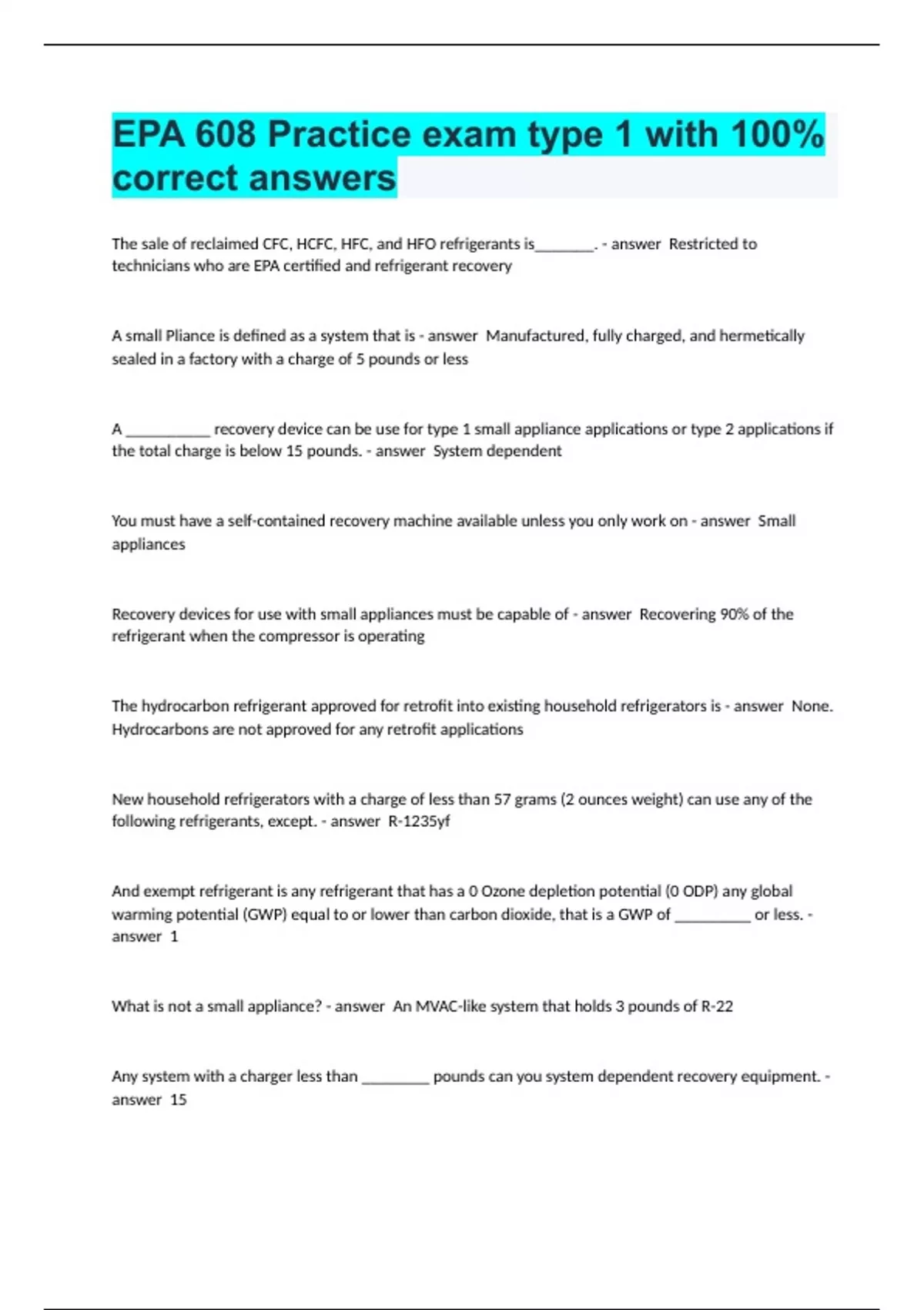 EPA 608 Practice exam type 1 with 100% correct answers.