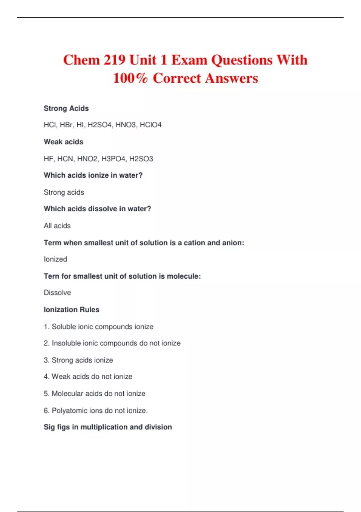 Chem 219 Unit 1 Exam Questions With 100% Correct Answers Strong Acids HCl, HBr, HI, H2SO4, HNO3, HClO4 Weak acids HF, HCN, HNO2, H3PO4, H2SO3 Which acids ionize in water? Strong acids Which acids dissolve in water? All acids Term when smallest unit of solution is a cation and anion: Ionized Tern for smallest unit of solution is molecule: Dissolve Ionization Rules 1. Soluble ionic compounds ionize 2. Insoluble ionic compounds do not ionize 3. Strong acids ionize 4. Weak acids do not ionize 5. Molecular acids do not ionize 6. Polyatomic ions do not ionize. Sig figs in multiplication and division