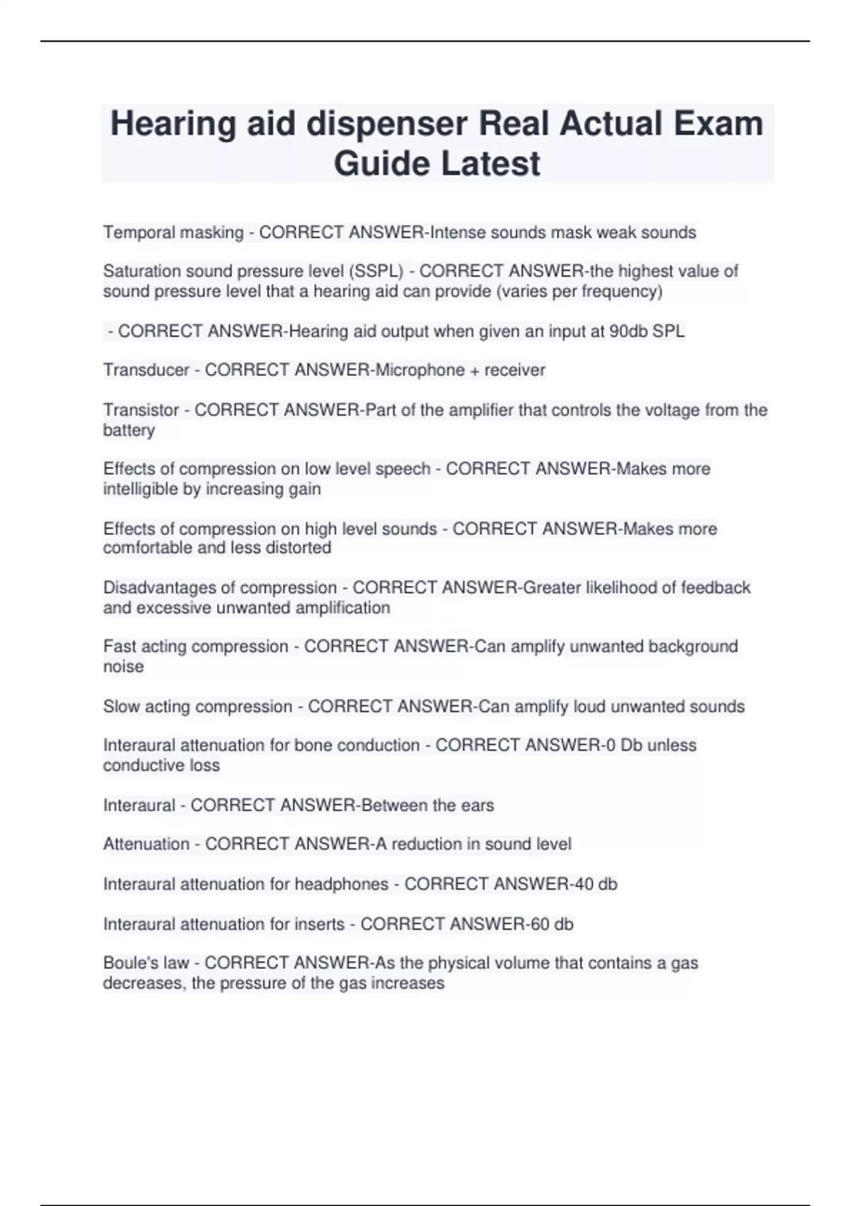 Hearing aid dispenser Real Actual Exam Guide Latest Temporal masking - CORRECT ANSWER-Intense sounds mask weak sounds Saturation sound pressure level (SSPL) - CORRECT ANSWER-the highest value of sound pressure level that a hearing aid can provide (varies per frequency) - CORRECT ANSWER-Hearing aid output when given an input at 90db SPL Transducer - CORRECT ANSWER-Microphone + receiver Transistor - CORRECT ANSWER-Part of the amplifier that controls the voltage from the battery Effects of compression on low level speech - CORRECT ANSWER-Makes more intelligible by increasing gain Effects of compression on high level sounds - CORRECT ANSWER-Makes more comfortable and less distorted Disadvantages of compression - CORRECT ANSWER-Greater likelihood of feedback and excessive unwanted amplification Fast acting compression - CORRECT ANSWER-Can amplify unwanted background noise Slow acting compression - CORRECT ANSWER-Can amplify loud unwanted sounds Interaural attenuation for bone conduction - CORRECT ANSWER-0 Db unless conductive loss Interaural - CORRECT A
