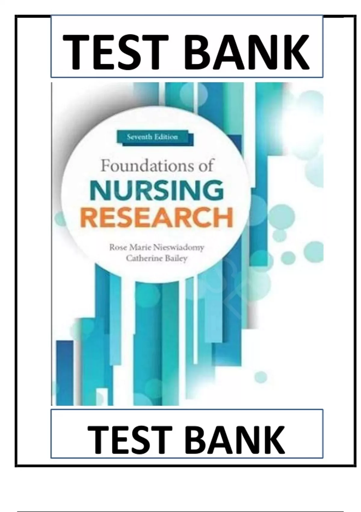 Test Bank for Foundations of Nursing Research 7th Edition By Rose Marie Nieswiadomy; Catherine Bailey Chapter 1-20 Complete Guide. 1 Development of Nursing Research 2 Evidence-Based Nursing Practice 3 Research Evidence in Nursing Practice 4 Ethical Issues in Nursing Research 5 An Overview of Quantitative and Qualitative Research 6 Identifying Nursing Research Problems 7 Review of the Literature 8 Theory and Nursing Research 9 Hypotheses 10 Quantitative Research Designs 11 Qualitative and Mixed Methods Research Designs 12 Populations and Samples 13 Measurement and Data Collection 14 Data-Collection Methods 15 Descriptive Statistics 16 Inferential Statistics 17 Presentation and Discussion of Study Findings 18 Communication and Utilization of Nursing Research 19 Nursing Research and Healthcare Economics 20 Critique of Research Reports