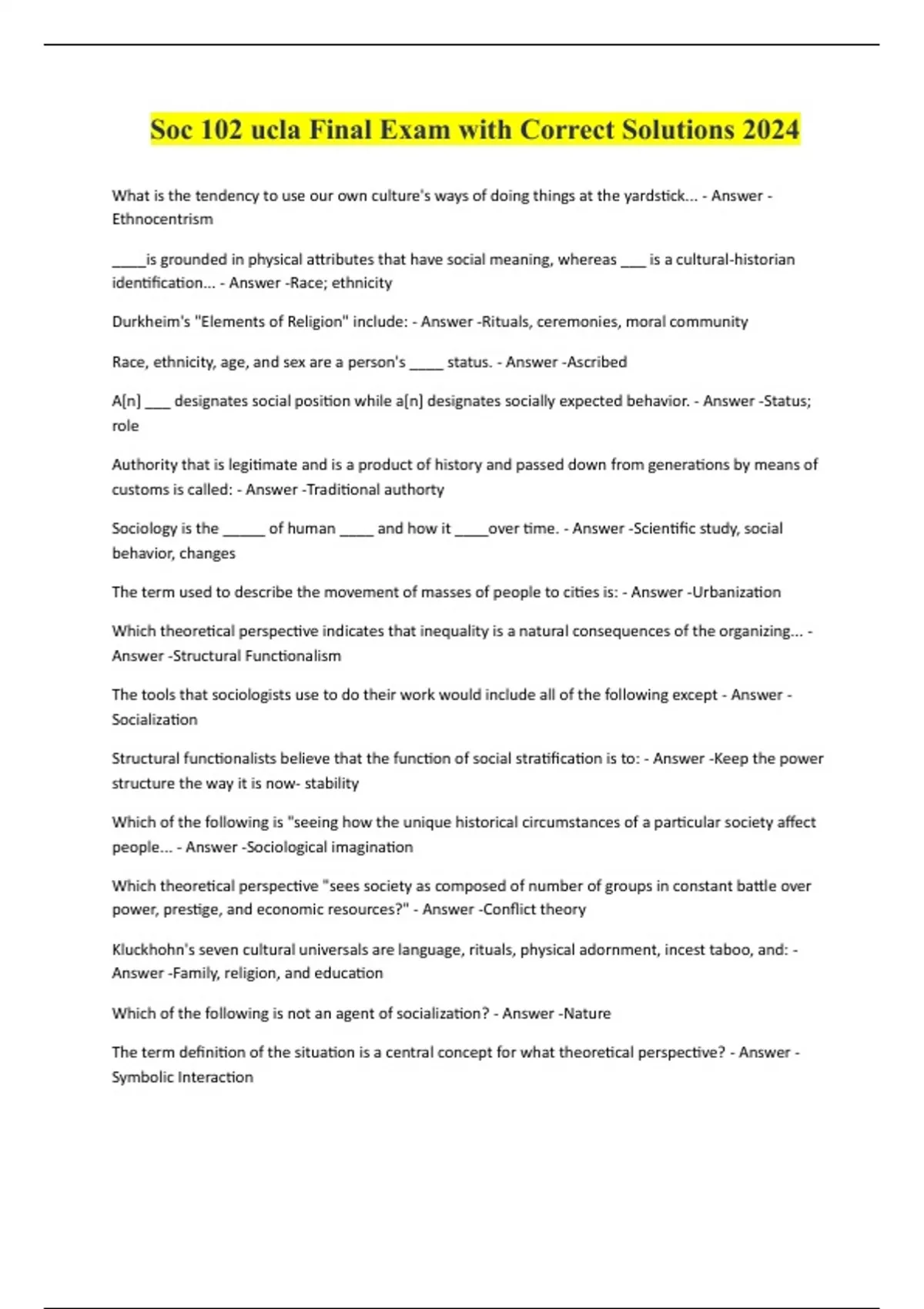 Soc 102 ucla Final Exam with Correct Solutions 2024 What is the tendency to use our own culture's ways of doing things at the yardstick... - Answer - Ethnocentrism ____is grounded in physical attributes that have social meaning, whereas ___ is a cultural-historian identification... - Answer -Race; ethnicity Durkheim's "Elements of Religion" include: - Answer -Rituals, ceremonies, moral community Race, ethnicity, age, and sex are a person's ____ status. - Answer -Ascribed A[n] ___ designates social position while a[n] designates socially expected behavior. - Answer -Status; role Authority that is legitimate and is a product of history and passed down from generations by means of customs is called: - Answer -Traditional authorty Sociology is the _____ of human ____ and how it ____over time. - Answer -Scientific study, social behavior, changes The term used to describe the movement of masses of people to cities is: - Answer -Urbanization Which theoretical perspective indicates that inequality is a natural consequences of the organizing... - Answer -Structural Functionalism The tools that sociologists use to do their work would include all of the following except - Answer - Socialization Structural functionalists believe that the function of social stratification is to: - Answer -Keep the power structure the way it is now- stability Which of the following is "seeing how the unique historical circumstances of a particular society affect people... - Answer -Sociological imagination Which theoretical perspective "sees society as composed of number of groups in constant battle over power, prestige, and economic resources?" - Answer -Conflict theory Kluckhohn's seven cultural universals are language, rituals, physical adornment, incest taboo, and: - Answer -Family, religion,