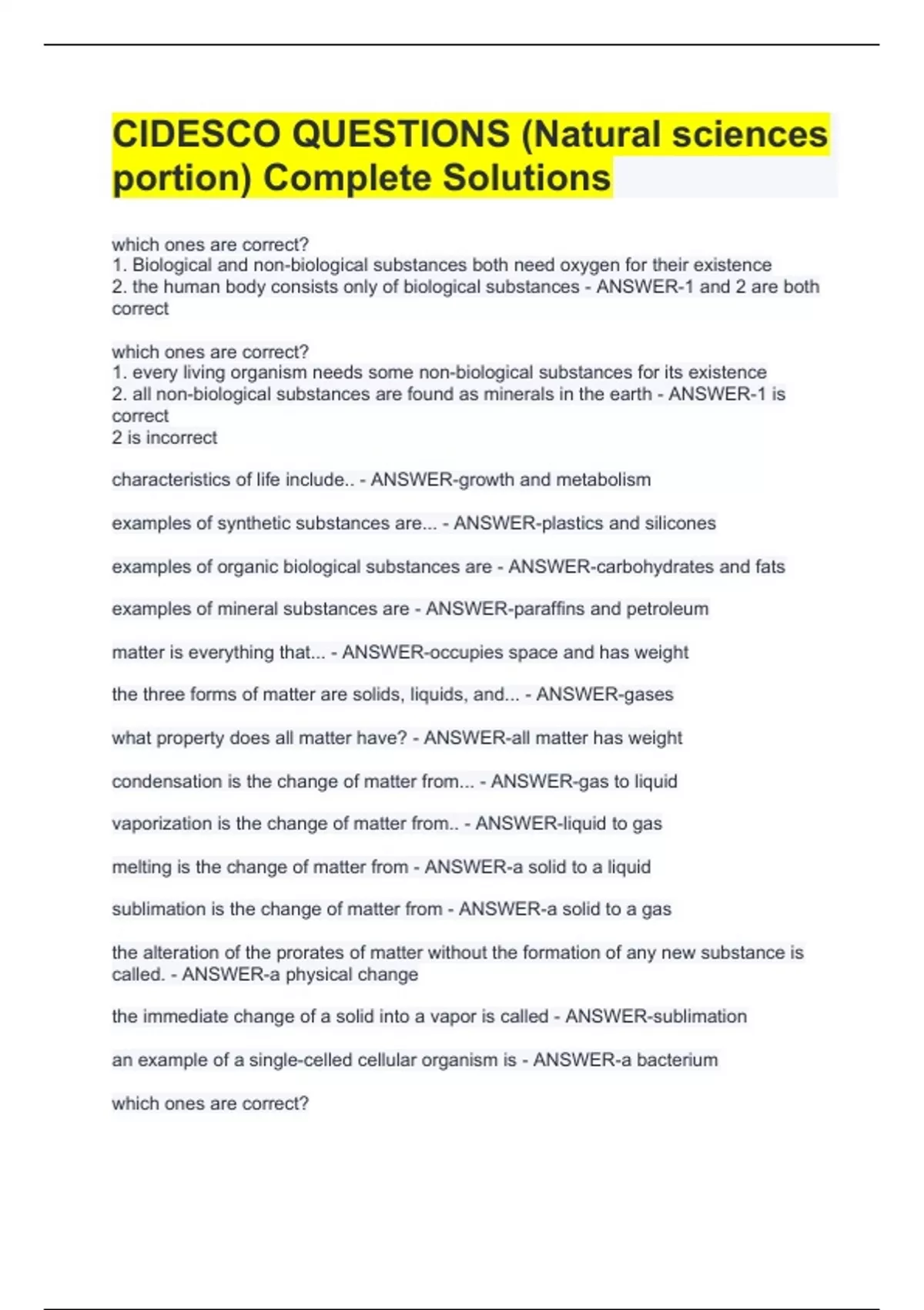 CIDESCO QUESTIONS (Natural sciences portion) Complete Solutions