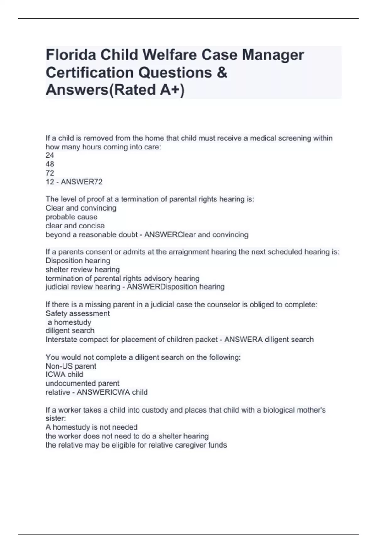 Florida Child Welfare Case Manager Certification Questions & Answers(Rated A+)