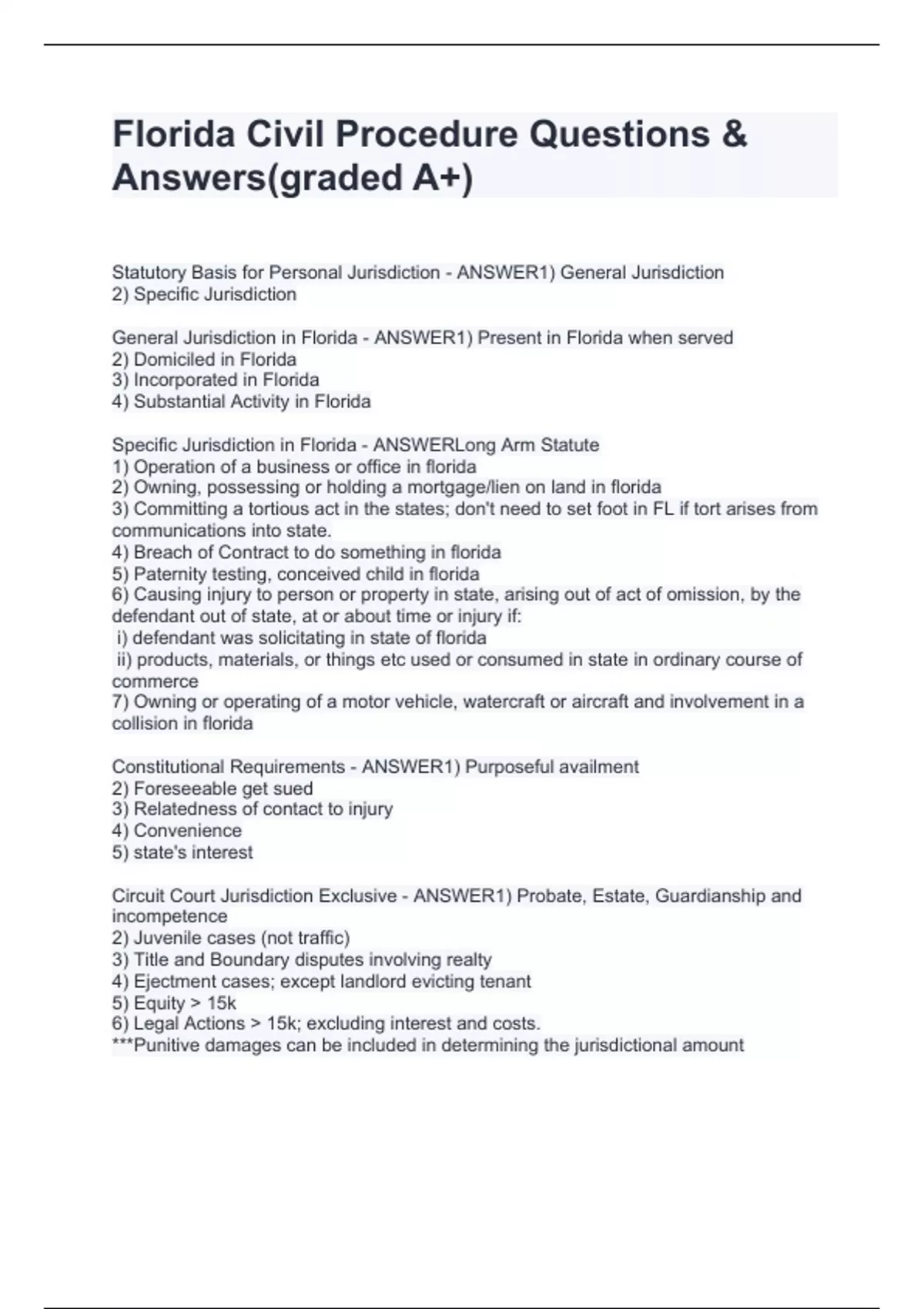 Statutory Basis for Personal Jurisdiction - ANSWER1) General Jurisdiction 2) Specific Jurisdiction General Jurisdiction in Florida - ANSWER1) Present in Florida when served 2) Domiciled in Florida 3) Incorporated in Florida 4) Substantial Activity in Florida Specific Jurisdiction in Florida - ANSWERLong Arm Statute 1) Operation of a business or office in florida 2) Owning, possessing or holding a mortgage/lien on land in florida 3) Committing a tortious act in the states; don't need to set foot in FL if tort arises from communications into state. 4) Breach of Contract to do something in florida 5) Paternity testing, conceived child in florida 6) Causing injury to person or property in state, arising out of act of omission, by the defendant out of state, at or about time or injury if: i) defendant was solicitating in state of florida ii) products, materials, or things etc used or consumed in state in ordinary course of commerce 7) Owning or operating of a motor vehicle, watercraft or aircraft and involvement in a collision in florida Constitutional Requirements - ANSWER1) Purposeful availment 2) Foreseeable get sued 3) Relatedness of contact to injury 4) Convenience 5) state's interest Circuit Court Jurisdiction Exclusive - ANSWER1) Probate, Estate, Guardianship and incompetence 2) Juvenile cases (not traffic) 3) Title and Boundary disputes involving realty 4) Ejectment cases; except landlord evicting tenant 5) Equity > 15k 6) Legal Actions > 15k; excluding interest and costs. ***Punitive damages can be included in determining the jurisdictional amount County Court Jurisdiction - ANSWER1) Legal Actions not exceeding 15k; doesn't include costs or interest (exclusive to county ct.) 2) Homeowners association disputes 3) Equity not exceeding 15k (not exclusive juried.) 4) Landlord evicting tenants; if involves 15k or less it MUST go to county ct., if more than 15k can go to either ct. 5) Violations of municipal or county ordinances. Aggregate Claims - ANSWER-Aggregate claims only if same T/O. However, once one