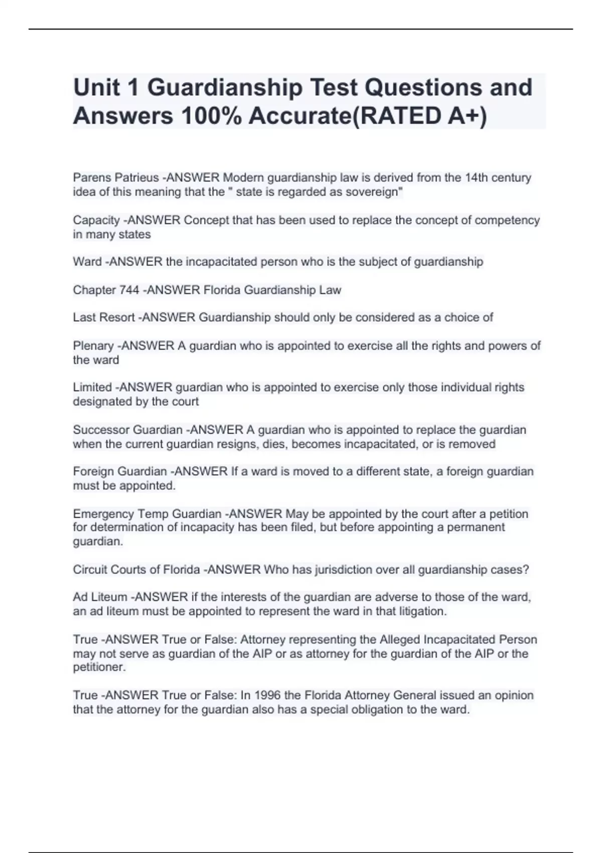 Unit 1 Guardianship Test Questions and Answers 100% Accurate(RATED A+)