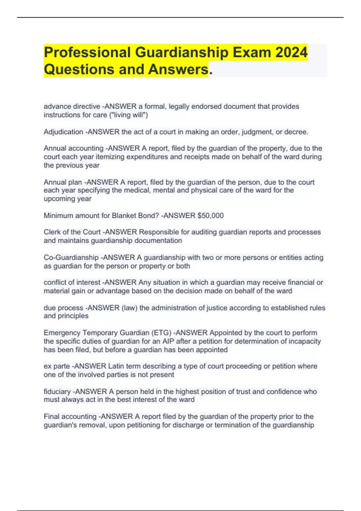 advance directive -ANSWER a formal, legally endorsed document that provides instructions for care ("living will") Adjudication -ANSWER the act of a court in making an order, judgment, or decree. Annual accounting -ANSWER A report, filed by the guardian of the property, due to the court each year itemizing expenditures and receipts made on behalf of the ward during the previous year Annual plan -ANSWER A report, filed by the guardian of the person, due to the court each year specifying the medical, mental and physical care of the ward for the upcoming year Minimum amount for Blanket Bond? -ANSWER $50,000 Clerk of the Court -ANSWER Responsible for auditing guardian reports and processes and maintains guardianship documentation Co-Guardianship -ANSWER A guardianship with two or more persons or entities acting as guardian for the person or property or both conflict of interest -ANSWER Any situation in which a guardian may receive financial or material gain or advantage based on the decision made on behalf of the ward due process -ANSWER (law) the administration of justice according to established rules and principles Emergency Temporary Guardian (ETG) -ANSWER Appointed by the court to perform the specific duties of guardian for an AIP after a petition for determination of incapacity has been filed, but before a guardian has been appointed ex parte -ANSWER Latin term describing a type of court proceeding or petition where one of the involved parties is not present fiduciary -ANSWER A person held in the highest position of trust and confidence who must always act in the best interest of the ward Final accounting -ANSWER A report filed by the guardian of the property prior to the guardian's removal, upon petitioning for discharge or termination of the guardianship