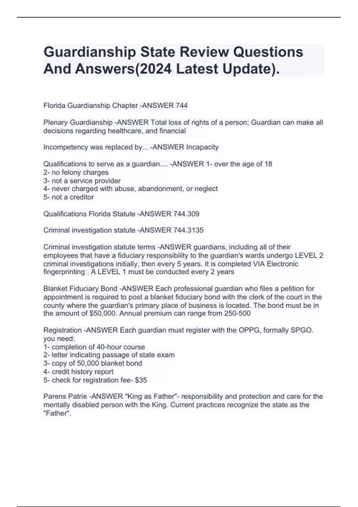 Florida Guardianship Chapter -ANSWER 744 Plenary Guardianship -ANSWER Total loss of rights of a person; Guardian can make all decisions regarding healthcare, and financial Incompetency was replaced by... -ANSWER Incapacity Qualifications to serve as a guardian.... -ANSWER 1- over the age of 18 2- no felony charges 3- not a service provider 4- never charged with abuse, abandonment, or neglect 5- not a creditor Qualifications Florida Statute -ANSWER 744.309 Criminal investigation statute -ANSWER 744.3135 Criminal investigation statute terms -ANSWER guardians, including all of their employees that have a fiduciary responsibility to the guardian's wards undergo LEVEL 2 criminal investigations initially, then every 5 years. It is completed VIA Electronic fingerprinting . A LEVEL 1 must be conducted every 2 years Blanket Fiduciary Bond -ANSWER Each professional guardian who files a petition for appointment is required to post a blanket fiduciary bond with the clerk of the court in the county where the guardian's primary place of business is located. The bond must be in the amount of $50,000. Annual premium can range from 250-500 Registration -ANSWER Each guardian must register with the OPPG, formally SPGO. you need: 1- completion of 40-hour course 2- letter indicating passage of state exam 3- copy of 50,000 blanket bond 4- credit history report 5- check for registration fee- $35 Parens Patrie -ANSWER "King as Father"- responsibility and protection and care for the mentally disabled person with the King. Current practices recognize the state as the "Father". Guardian Advocate for mentally ill -ANSWER 394.4598 -Persona appointed to make medical and mental health decisions for an individual who has been hospitalized under FS 394 Guardian Advocate -ANSWER Appoints guardian for people who have developmental disabilities. Once appointed, the guardian advocate is governed by FS 744 and must abide by same requirements as other court appointed guardians Pre-need guardian -ANSWER 744.3045 - Competent adult may name a preneed guardian to serve in the event of becoming incapacitated. Written declaration can be filed with the clerk of court - Within 20 days after assuming duties, the preneed guardian must petition the court for confirmation of appointment