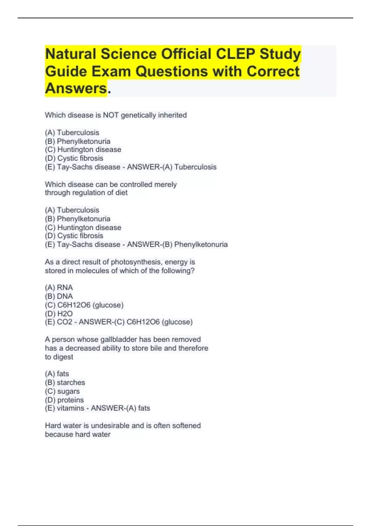 Which disease is NOT genetically inherited (A) Tuberculosis (B) Phenylketonuria (C) Huntington disease (D) Cystic fibrosis (E) Tay-Sachs disease - ANSWER-(A) Tuberculosis Which disease can be controlled merely through regulation of diet (A) Tuberculosis (B) Phenylketonuria (C) Huntington disease (D) Cystic fibrosis (E) Tay-Sachs disease - ANSWER-(B) Phenylketonuria As a direct result of photosynthesis, energy is stored in molecules of which of the following? (A) RNA (B) DNA (C) C6H12O6 (glucose) (D) H2O (E) CO2 - ANSWER-(C) C6H12O6 (glucose) A person whose gallbladder has been removed has a decreased ability to store bile and therefore to digest (A) fats (B) starches (C) sugars (D) proteins (E) vitamins - ANSWER-(A) fats Hard water is undesirable and is often softened because hard water