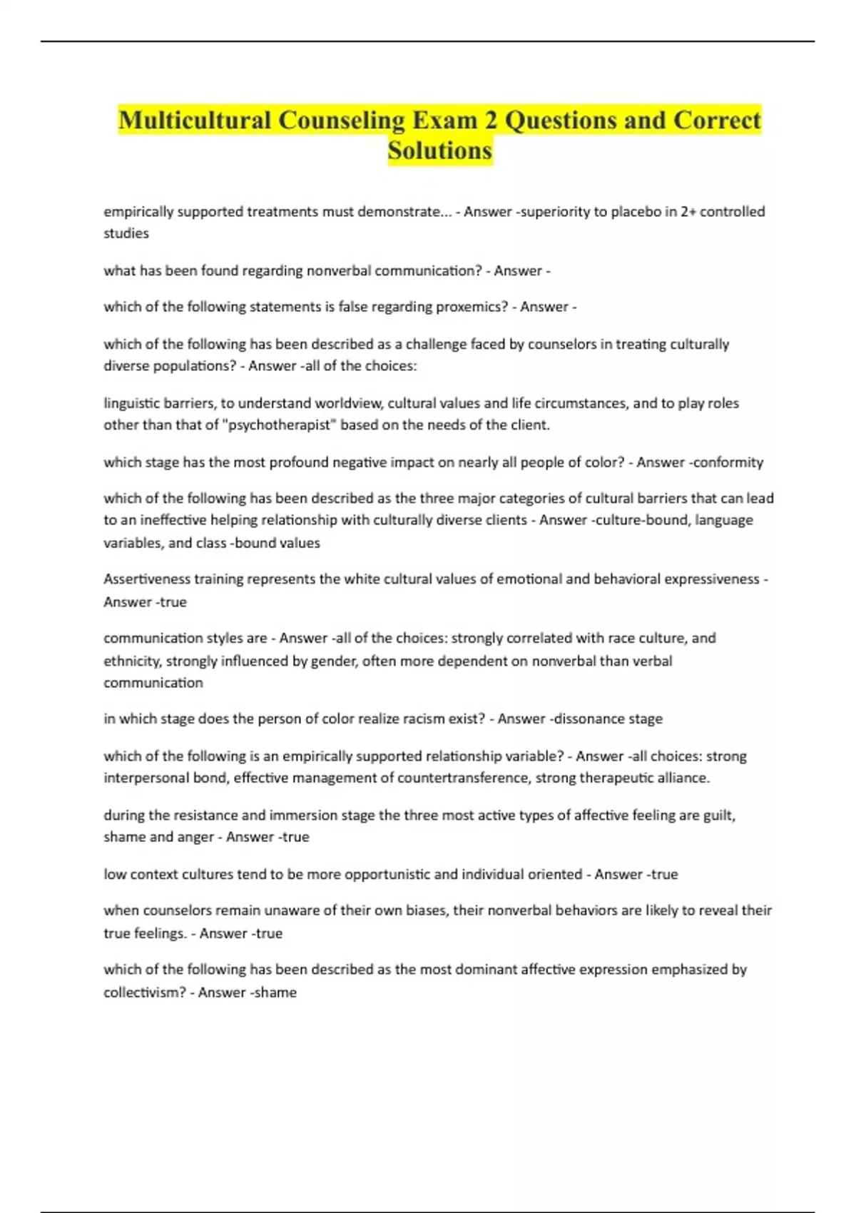 Multicultural Counseling Exam 2 Questions and Correct Solutions empirically supported treatments must demonstrate... - Answer -superiority to placebo in 2+ controlled studies what has been found regarding nonverbal communication? - Answer - which of the following statements is false regarding proxemics? - Answer - which of the following has been described as a challenge faced by counselors in treating culturally diverse populations? - Answer -all of the choices: linguistic barriers, to understand worldview, cultural values and life circumstances, and to play roles other than that of "psychotherapist" based on the needs of the client. which stage has the most profound negative impact on nearly all people of color? - Answer -conformity which of the following has been described as the three major categories of cultural barriers that can lead to an ineffective helping relationship with culturally diverse clients - Answer -culture-bound, language variables, and class -bound values Assertiveness training represents the white cultural values of emotional and behavioral expressiveness - Answer -true communication styles are - Answer -all of the choices: strongly correlated with race culture, and ethnicity, strongly influenced by gender, often more dependent on nonverbal than verbal communication