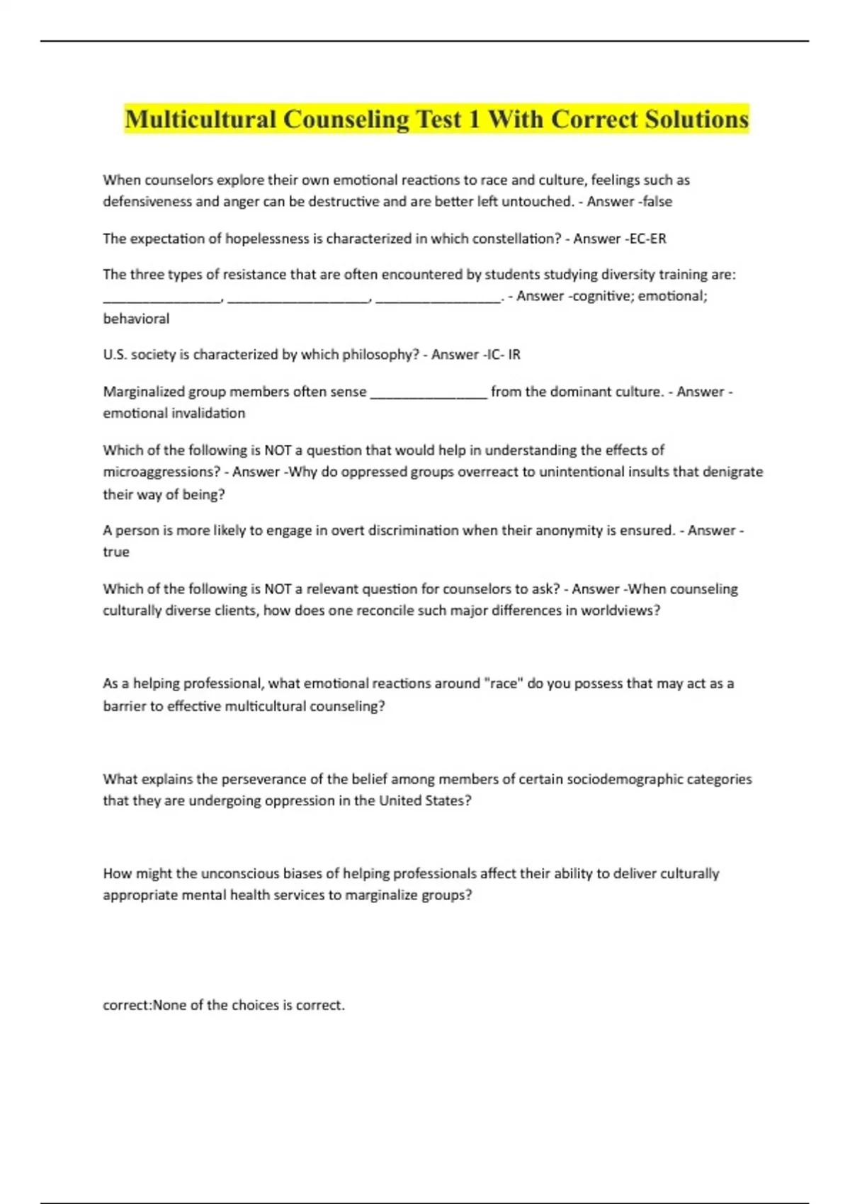 Multicultural Counseling Test 1 With Correct Solutions When counselors explore their own emotional reactions to race and culture, feelings such as defensiveness and anger can be destructive and are better left untouched. - Answer -false The expectation of hopelessness is characterized in which constellation? - Answer -EC-ER The three types of resistance that are often encountered by students studying diversity training are: _______________, __________________, ________________. - Answer -cognitive; emotional; behavioral U.S. society is characterized by which philosophy? - Answer -IC- IR Marginalized group members often sense _______________ from the dominant culture. - Answer - emotional invalidation Which of the following is NOT a question that would help in understanding the effects of microaggressions? - Answer -Why do oppressed groups overreact to unintentional insults that denigrate their way of being? A person is more likely to engage in overt discrimination when their anonymity is ensured. - Answer - true Which of the following is NOT a relevant question for counselors to ask? - Answer -When counseling culturally diverse clients, how does one reconcile such major differences in worldviews? As a helping professional, what emotional reactions around "race" do you possess that may act as a barrier to effective multicultural counseling? What explains the perseverance of the belief among members of certain sociodemographic categories that they are undergoing oppression in the United States? How might the unconscious biases of helping professionals affect their ability to deliver culturally appropriate mental health services to marginalize group