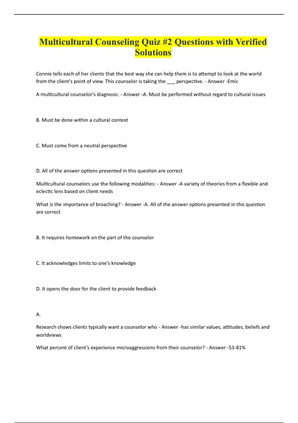 Multicultural Counseling Quiz #2 Questions with Verified Solutions Connie tells each of her clients that the best way she can help them is to attempt to look at the world from the client's point of view. This counselor is taking the ___ perspective. - Answer -Emic A multicultural counselor's diagnosis: - Answer -A. Must be performed without regard to cultural issues B. Must be done within a cultural context C. Must come from a neutral perspective D. All of the answer options presented in this question are correct Multicultural counselors use the following modalities: - Answer -A variety of theories from a flexible and eclectic lens based on client needs What is the importance of broaching? - Answer -A. All of the answer options presented in this question are correct B. It requires homework on the part of the counselor C. It acknowledges limits to one's knowledge D. It opens the door for the client to provide feedback A. Research shows clients typically want a counselor who - Answer -has similar values, attitudes, beliefs and worldviews What percent of client's experience microaggressions f