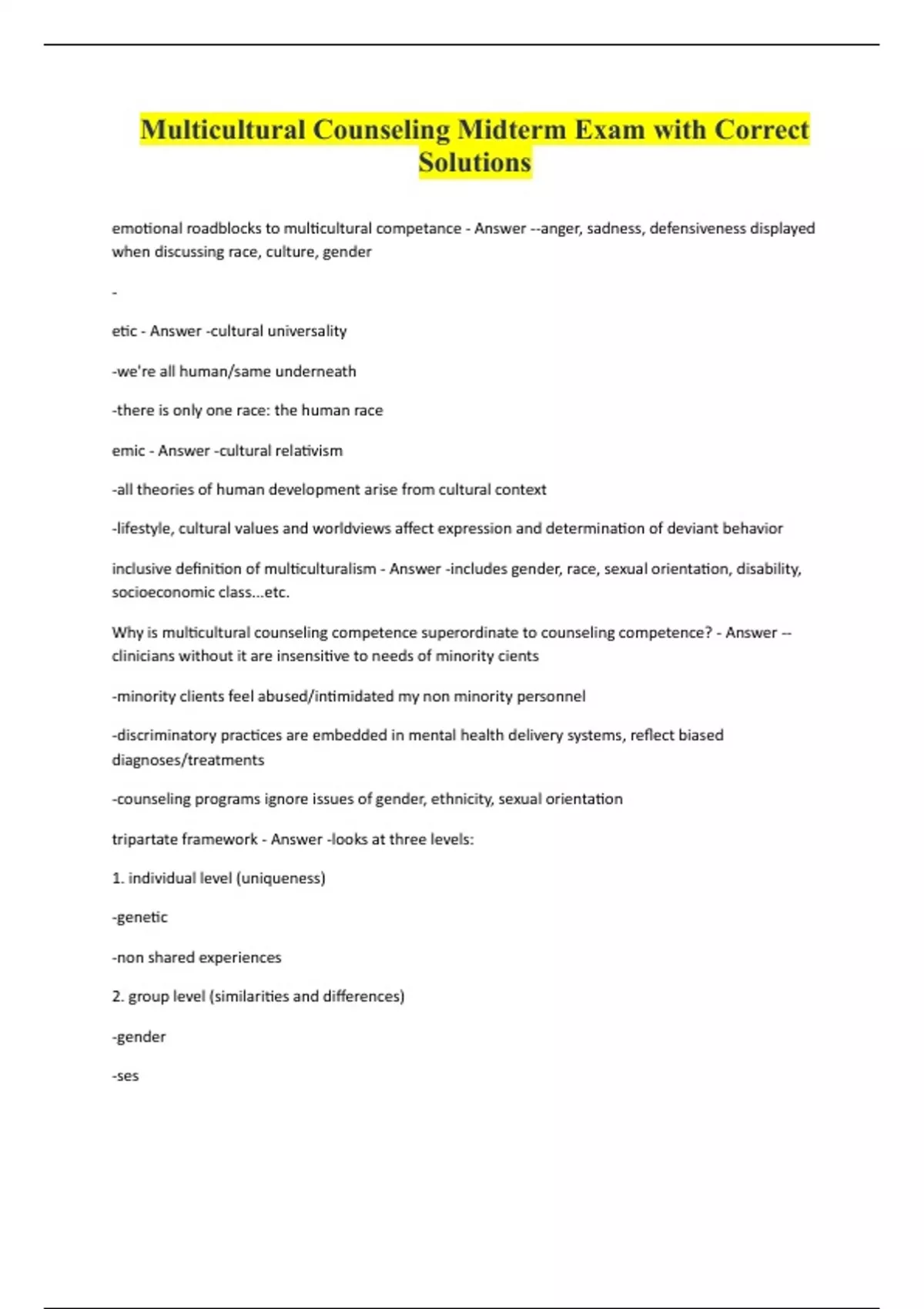 Multicultural Counseling Midterm Exam with Correct Solutions emotional roadblocks to multicultural competance - Answer --anger, sadness, defensiveness displayed when discussing race, culture, gender - etic - Answer -cultural universality -we're all human/same underneath -there is only one race: the human race emic - Answer -cultural relativism -all theories of human development arise from cultural context -lifestyle, cultural values and worldviews affect expression and determination of deviant behavior inclusive definition of multiculturalism - Answer -includes gender, race, sexual orientation, disability, socioeconomic class...etc. Why is multicultural counseling competence superordinate to counseling competence? - Answer -- clinicians without it are insensitive to needs of minority cients -minority clients feel abused/intimidated my non minority personnel -discriminatory practices are embedded in mental health delivery systems, reflect biased diagnoses/treatments -counseling programs ignore issues of gender, ethnicity, sexual orientation tripartate framework - Answer -looks at three levels: 1. individual level (uniqueness) -genetic -non shared experiences 2. group level (similarities and differences) -gender -ses-marital status -age -location -race -sexual orientation -ethnicity, culture 3. universal level (homo sapiens) -common life experiences -ability to use symbols -self awareness -biological similariti