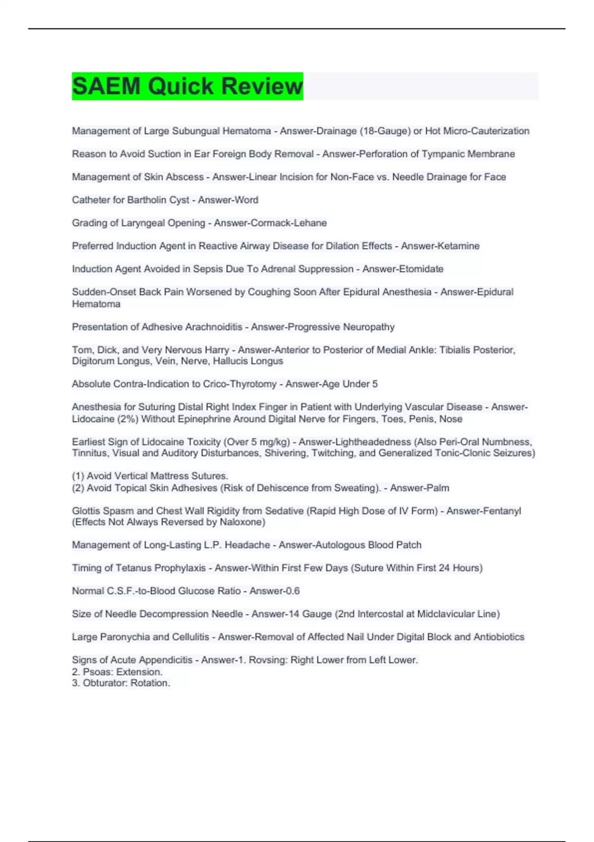 SAEM Quick Review Management of Large Subungual Hematoma - Answer-Drainage (18-Gauge) or Hot Micro-Cauterization Reason to Avoid Suction in Ear Foreign Body Removal - Answer-Perforation of Tympanic Membrane Management of Skin Abscess - Answer-Linear Incision for Non-Face vs. Needle Drainage for Face Catheter for Bartholin Cyst - Answer-Word Grading of Laryngeal Opening - Answer-Cormack-Lehane Preferred Induction Agent in Reactive Airway Disease for Dilation Effects - Answer-Ketamine Induction Agent Avoided in Sepsis Due To Adrenal Suppression - Answer-Etomidate Sudden-Onset Back Pain Worsened by Coughing Soon After Epidural Anesthesia - Answer-Epidural Hematoma Presentation of Adhesive Arachnoiditis - Answer-Progressive Neuropathy Tom, Dick, and Very Nervous Harry - Answer-Anterior to Posterior of Medial Ankle: Tibialis Posterior, Digitorum Longus, Vein, Nerve, Hallucis Longus Absolute Contra-Indication to Crico-Thyrotomy - Answer-Age Under 5 Anesthesia for Suturing Distal Right Index Finger in Patient with Underlying Vascular Disease - Answer-Lidocaine (2%) Without Epinephrine Around Digital Nerve for Fingers, Toes, Penis, Nose Earliest Sign of Lidocaine Toxicity (Over 5 mg/kg) - Answer-Lightheadedness (Also Peri-Oral Numbness, Tinnitus, Visual and Auditory Disturbances, Shivering, Twitching, and Generalized Tonic-Clonic Seizures) (1) Avoid Vertical Mattress Sutures. (2) Avoid Topical Skin Adhesives (Risk of Dehiscence from Sweating). - Answer-Palm Glottis Spasm and Chest Wall Rigidity from Sedative (Rapid High Dose of IV Form) - Answer-Fentanyl (Effects Not Always Reversed by Naloxone) Management of Long-Lasting L.P. Headache - Answer-Autologous Blood Patch Timing of Tetanus Prophylaxis - Answer-Within First Few Days (Suture Within First 24 Hours) Normal C.S.F.-to-Blood Glucose Ratio - Answer-0.6 Size of Needle Decompression Needle - Answer-14 Gauge (2nd Intercostal at Midclavicular Line) Large Paronychia and Cellulitis - Answer-Removal of Affected Nail Under Digital Block and Antiobiotics Signs of Acute Appendicitis - Answer-1. Rovsing: Right Lower from Left Lower. 2. Psoas: Extension. 3. Obturator: Rotation. Suggested by Abdominal Pain Preceding Nausea and Vomiting - Answer-Sur