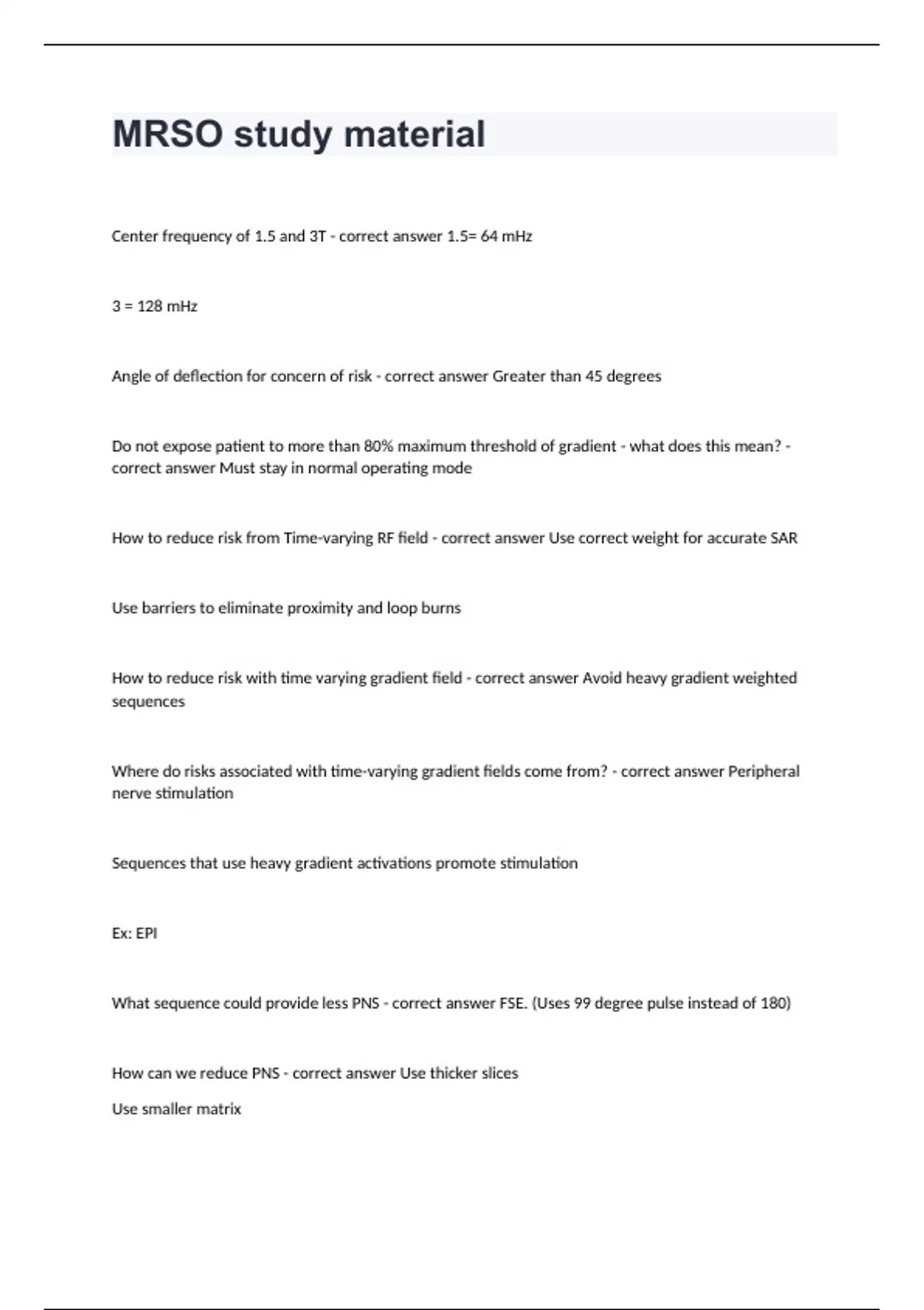 MRSO study materialCenter frequency of 1.5 and 3T - correct answer 1.5= 64 mHz 3 = 128 mHz Angle of deflection for concern of risk - correct answer Greater than 45 degrees Do not expose patient to more than 80% maximum threshold of gradient - what does this mean? - correct answer Must stay in normal operating mode How to reduce risk from Time-varying RF field - correct answer Use correct weight for accurate SAR Use barriers to eliminate proximity and loop burns How to reduce risk with time varying gradient field - correct answer Avoid heavy gradient weighted sequences Where do risks associated with time-varying gradient fields come from? - correct answer Peripheral nerve stimulation Sequences that use heavy gradient activations promote stimulation Ex: EPI What sequence could provide less PNS - correct answer FSE. (Uses 99 degree pulse instead of 180) How can we reduce PNS - correct answer Use thicker slices Use smaller matrix Use larger field of view How can we reduce patient heating - correct answer Use Gradient Echo pulse (it uses minimal RF pulses) Eliminate fatsat and saturation band Avoid inverse recovery Decrease flip angle Increase TR and echo spacing (by decreasing bw) Decrease slices and matrix Increase concatenations Use parallel imaging Decrease averages To reduce SAR - correct answer Increase each spacing Reduce bandwidth Increase frequency encoding Increase echo times Decrease phase encoding Parallel imaging Half Fourier Use gradient echoes Decrease ETL
