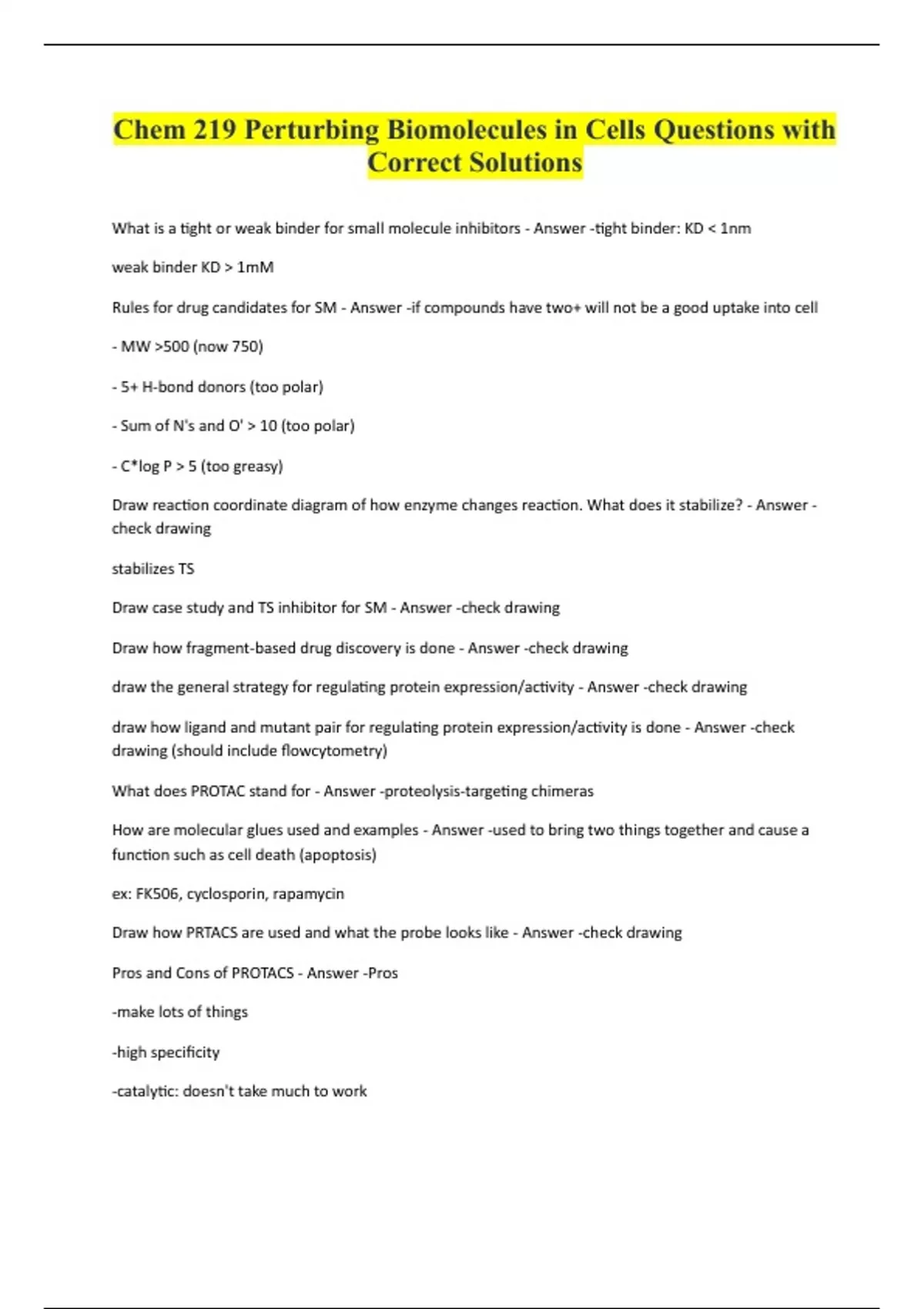 Chem 219 Perturbing Biomolecules in Cells Questions with Correct Solutions What is a tight or weak binder for small molecule inhibitors - Answer -tight binder: KD < 1nm weak binder KD > 1mM Rules for drug candidates for SM - Answer -if compounds have two+ will not be a good uptake into cell - MW >500 (now 750) - 5+ H-bond donors (too polar) - Sum of N's and O' > 10 (too polar) - C*log P > 5 (too greasy) Draw reaction coordinate diagram of how enzyme changes reaction. What does it stabilize? - Answer - check drawing stabilizes TS Draw case study and TS inhibitor for SM - Answer -check drawing Draw how fragment-based drug discovery is done - Answer -check drawing draw the general strategy for regulating protein expression/activity - Answer -check drawing