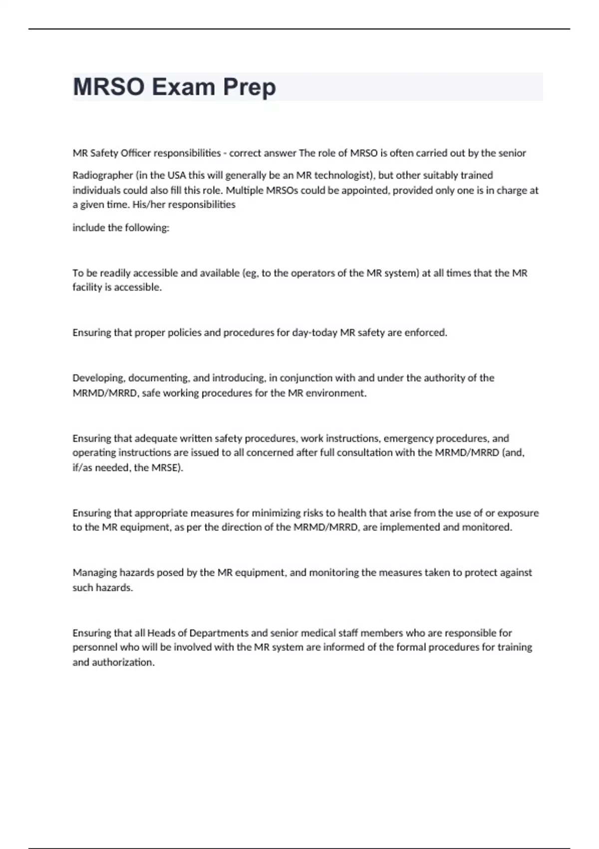 MRSO Exam PrepMR Safety Officer responsibilities - correct answer The role of MRSO is often carried out by the senior Radiographer (in the USA this will generally be an MR technologist), but other suitably trained individuals could also fill this role. Multiple MRSOs could be appointed, provided only one is in charge at a given time. His/her responsibilities include the following: To be readily accessible and available (eg, to the operators of the MR system) at all times that the MR facility is accessible. Ensuring that proper policies and procedures for day-today MR safety are enforced. Developing, documenting, and introducing, in conjunction with and under the authority of the MRMD/MRRD, safe working procedures for the MR environment. Ensuring that adequate written safety procedures, work instructions, emergency procedures, and operating instructions are issued to all concerned after full consultation with the MRMD/MRRD (and, if/as needed, the MRSE). Ensuring that appropriate measures for minimizing risks to health that arise from the use of or exposure to the MR equipment, as per the direction of the MRMD/MRRD, are implemented and monitored. Managing hazards posed by the MR equipment, and monitoring the measures taken to protect against such hazards. Ensuring that all Heads of Departments and senior medical staff members who are responsible for personnel who will be involved with the MR system are informed of the formal procedures for training and authorization. Ensuring that medical, technical, nursing, and all other relevant staff groups (including ancillary workers) who may be exposed to the MR environment are educated appropriately on a regular basis as to the safety requirements and updated as necessary. Maintaining records of the personnel who have been educated appropriately as to the safety requirements. Consulting the MRMD/MRRD (and/or the MRSE) when further adv Magnetophosphenes - correct answer A Sensory Symptom where the subject sees flashing lights caused by an induced electrical current in the retina when exposed to a strong magnetic field. Bo - correct answer Static magnetic field direction dBo/Dx - correct answer Gradient magnetic field - Change in Magnetic Field / change in distance American Board of Magnetic Resonance Safety ABMRS provides MR Safety Credentialing for: - correct answer MR Medical Director (MRMD) MR Safety Officers (MRSO) MR Safety Experts (MRSE) The MRMD certification is designed for: - correct answer physicians, such as radiologists, who have responsibility for the safe administration of MR exams. The MRSO certification is designed for: - correct answer those with a supervisory MRI safety role at the point of care. While not exclusive to technologists, this role is most frequently be filled by an MR technologist.