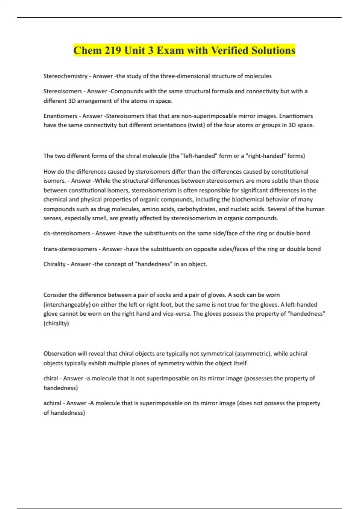 Chem 219 Unit 3 Exam with Verified Solutions Stereochemistry - Answer -the study of the three-dimensional structure of molecules Stereoisomers - Answer -Compounds with the same structural formula and connectivity but with a different 3D arrangement of the atoms in space. Enantiomers - Answer -Stereoisomers that that are non-superimposable mirror images. Enantiomers have the same connectivity but different orientations (twist) of the four atoms or groups in 3D space. The two different forms of the chiral molecule (the "left-handed" form or a "right-handed" forms) How do the differences caused by steroisomers differ than the differences caused by constitutional isomers. - Answer -While the structural differences between stereoisomers are more subtle than those between constitutional isomers, stereoisomerism is often responsible for significant differences in the chemical and physical properties of organic compounds, including the biochemical behavior of many compounds such as drug molecules, amino acids, carbohydrates, and nucleic acids. Several of the human senses, especially smell, are greatly affected by stereoisomerism in organic compounds. cis-stereoisomers - Answer -have the substituents on the same side/face of the ring or double bond trans-stereoisomers - Answer -have the substituents on opposite sides/faces of the ring or double bond Chirality - Answer -the concept of "handedness" in an object. Consider the difference between a pair of socks and a pair of gloves. A sock can be worn (interchangeably) on either the left or right foot, but the same is not true for the gloves. A left-handed glove cannot be worn on the right hand and vice-versa. The gloves possess the property of "handedness" (chirality) Observation will reveal that chiral objects are typically not symmetrical (asymmetric), while achiral objects typically exhibit multiple planes of symmetry within the object itself. chiral - Answer -a molecule that is not superimposable on its mirror image (possesses the property of handedness) achiral - Answer -A molecule that is superimposable on its mirror image (does not possess the property of handedness)