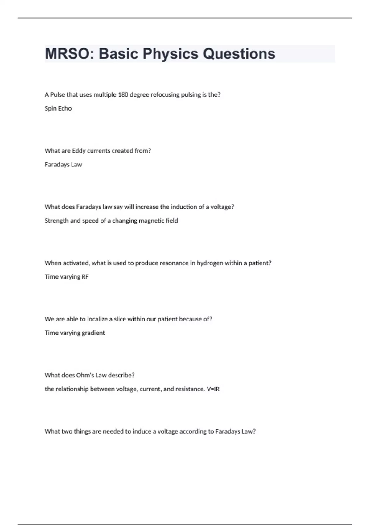 MRSO: Basic Physics Questions A Pulse that uses multiple 180 degree refocusing pulsing is the? Spin Echo What are Eddy currents created from? Faradays Law What does Faradays law say will increase the induction of a voltage? Strength and speed of a changing magnetic field When activated, what is used to produce resonance in hydrogen within a patient? Time varying RF We are able to localize a slice within our patient because of? Time varying gradient What does Ohm's Law describe? the relationship between voltage, current, and resistance. V=IR What two things are needed to induce a voltage according to Faradays Law? Magnetic Field and an electrically conductive material What do Lenz's Force describe? Opposing forces produced in an electrically conductive material in a changing magnetic field. What is the formula for Faradays Law of induction? E=Dt/do