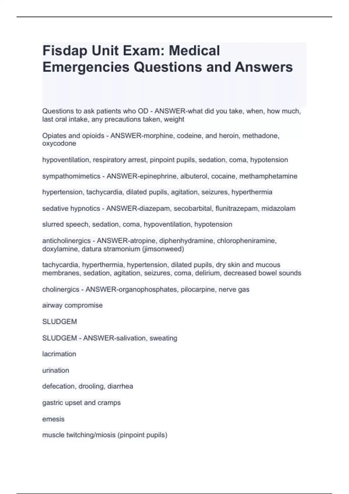 Opiates and opioids - ANSWER-morphine, codeine, and heroin, methadone, oxycodone hypoventilation, respiratory arrest, pinpoint pupils, sedation, coma, hypotension sympathomimetics - ANSWER-epinephrine, albuterol, cocaine, methamphetamine hypertension, tachycardia, dilated pupils, agitation, seizures, hyperthermia sedative hypnotics - ANSWER-diazepam, secobarbital, flunitrazepam, midazolam slurred speech, sedation, coma, hypoventilation, hypotension anticholinergics - ANSWER-atropine, diphenhydramine, chloropheniramine, doxylamine, datura stramonium (jimsonweed) tachycardia, hyperthermia, hypertension, dilated pupils, dry skin and mucous membranes, sedation, agitation, seizures, coma, delirium, decreased bowel sounds cholinergics - ANSWER-organophosphates, pilocarpine, nerve gas airway compromise SLUDGEM SLUDGEM - ANSWER-salivation, sweating lacrimation urination defecation, drooling, diarrhea gastric upset and cramps emesis muscle twitching/miosis (pinpoint pupils) miosis - ANSWER-excessively constricted pupil, often bilateral after exposure to nerve agents. Inhaled poisons - ANSWER-can cause hypoxia (CO), airway obstruction and pulmonary edema (chlorine gas), burning eyes, sore throat, cough, chest pain, hoarseness, wheezing, respiratory distress, dizziness, confusion, headache, stridor, seizures, altered mental status, treat by removing the patient from exposure and applying oxygen