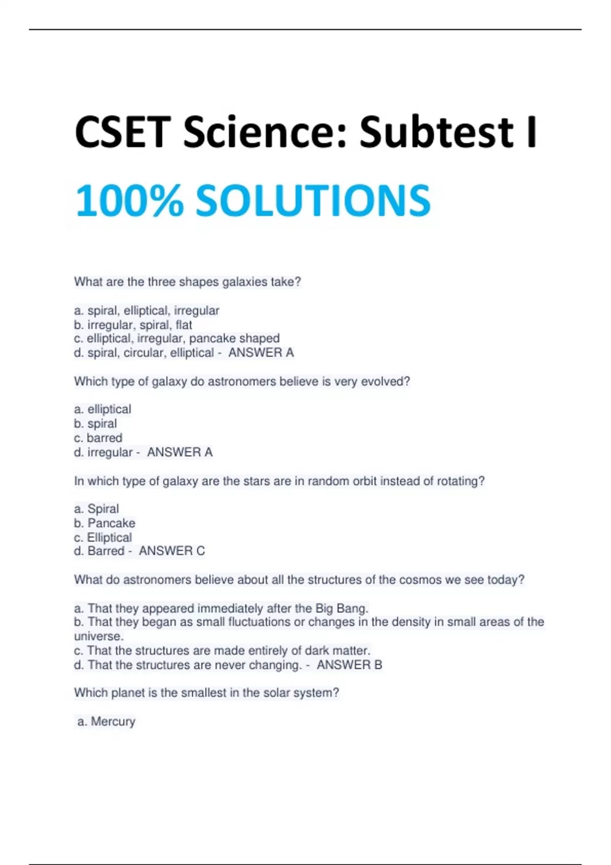 CSET Science: Subtest I 100% SOLUTIONS What are the three shapes galaxies take? a. spiral, elliptical, irregular b. irregular, spiral, flat c. elliptical, irregular, pancake shaped d. spiral, circular, elliptical - ANSWER A Which type of galaxy do astronomers believe is very evolved? a. elliptical b. spiral c. barred d. irregular - ANSWER A In which type of galaxy are the stars are in random orbit instead of rotating? a. Spiral b. Pancake c. Elliptical d. Barred - ANSWER C What do astronomers believe about all the structures of the cosmos we see today? a. That they appeared immediately after the Big Bang. b. That they began as small fluctuations or changes in the density in small areas of the universe. c. That the structures are made entirely of dark matter. d. That the structures are never changing. - ANSWER B Which planet is the smallest in the solar system? a. Mercury b. Venus c. Both Mercury and Venus d. Earth e. Mars - ANSWER A Which of the planets rotates backwards? a. Venus b. Earth c. Mars d. Both Venus and Earth e. Mercury - ANSWER A Which of the inner planets is the hottest? a. Both Mercury and Venus b. Venus c. Earth d. Mars e. Mercury - ANSWER B Which of the planets has a large satellite? a. Mars b. Earth c. Mercury d. Venus e. Mars and Earth - ANSWER B What are the planets in order from the sun? a. Earth, Mars, Venus, Mercury b. Venus, Earth, Mercury, Mars c. Mercury, Venus, Earth, Mars d. Venus, Mercury, Earth, Mars e. Mars, Earth, Venus, Mercury - ANSWER C Which planet is known for its rings? a. Pluto b. Uranus c. Neptune d. Saturn e. Jupiter - ANSWER D Which planet is known as the blue planet? a. Pluto b. Saturn c. Neptune d. Uranus e. Jupiter - ANSWER C What are the four outer planets in order from the sun? a. Jupiter, Saturn, Uranus, Neptune b. Uranus, Neptune, Saturn, Jupiter c. Neptune, Uranus, Saturn, Jupiter d. Jupiter, Saturn, Neptune, Uranus e. Saturn, Jupter, Neptune, Uranus - ANSWER A Which planet is tipped on its side and spins nearly horizontally? a. Jupite