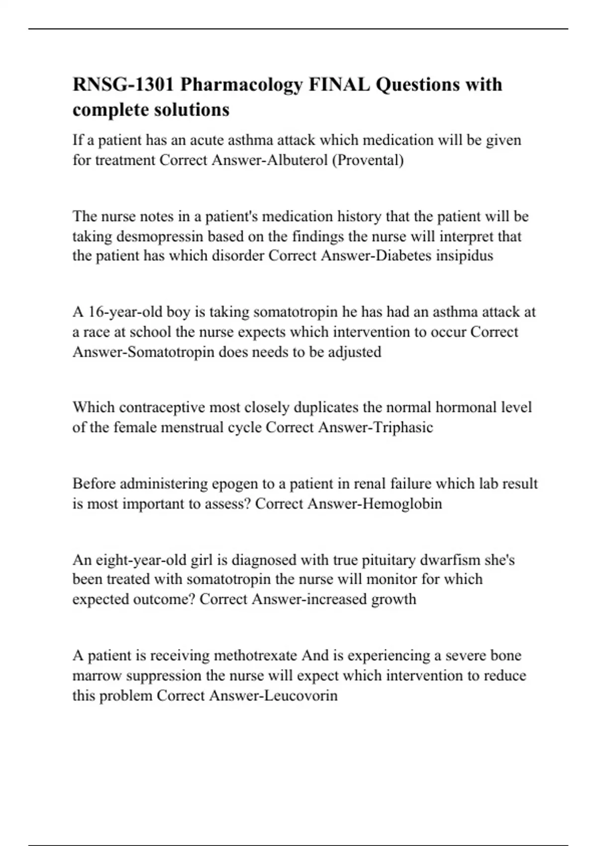 RNSG-1301 Pharmacology FINAL Questions with complete solutions