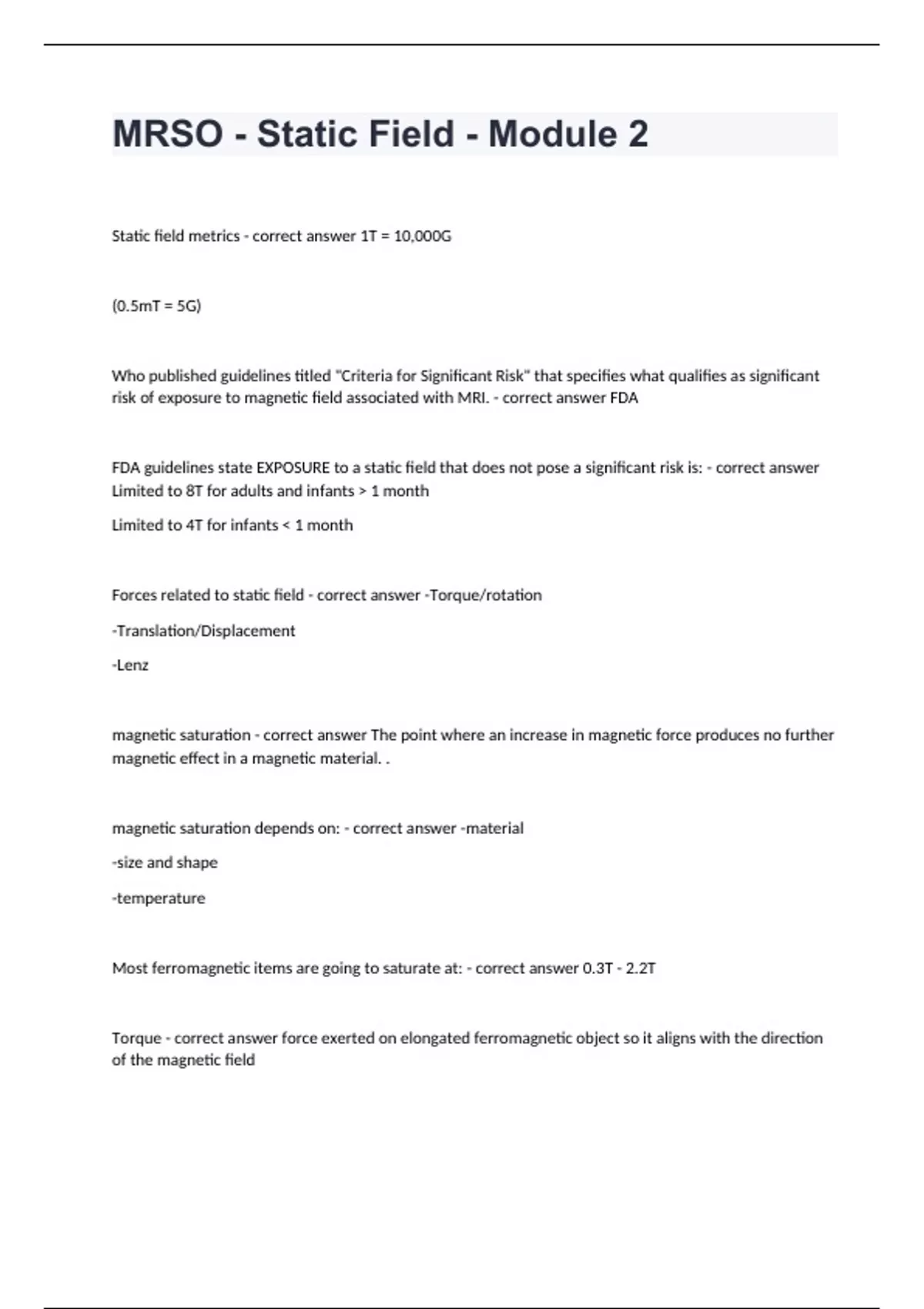 MRSO - Static Field - Module 2Static field metrics - correct answer 1T = 10,000G (0.5mT = 5G) Who published guidelines titled "Criteria for Significant Risk" that specifies what qualifies as significant risk of exposure to magnetic field associated with MRI. - correct answer FDA FDA guidelines state EXPOSURE to a static field that does not pose a significant risk is: - correct answer Limited to 8T for adults and infants > 1 month Limited to 4T for infants < 1 month Forces related to static field - correct answer -Torque/rotation -Translation/Displacement -Lenz magnetic saturation - correct answer The point where an increase in magnetic force produces no further magnetic effect in a magnetic material. . magnetic saturation depends on: - correct answer -material -size and shape -temperature Most ferromagnetic items are going to saturate at: - correct answer 0.3T - 2.2T Torque - correct answer force exerted on elongated ferromagnetic object so it aligns with the direction of the magnetic field