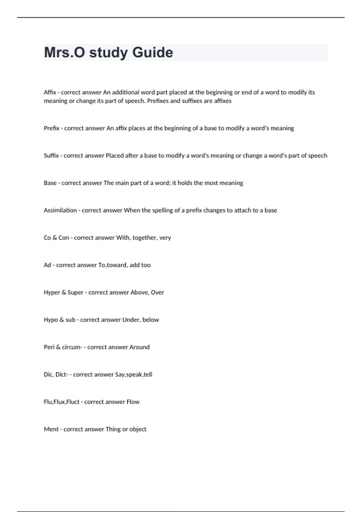 Mrs.O study Guide Affix - correct answer An additional word part placed at the beginning or end of a word to modify its meaning or change its part of speech. Prefixes and suffixes are affixes Prefix - correct answer An affix places at the beginning of a base to modify a word's meaning Suffix - correct answer Placed after a base to modify a word's meaning or change a word's part of speech Base - correct answer The main part of a word; it holds the most meaning Assimilation - correct answer When the spelling of a prefix changes to attach to a base Co & Con - correct answer With, together, very Ad - correct answer To,toward, add too Hyper & Super - correct answer Above, Over Hypo & sub - correct answer Under, below Peri & circum- - correct answer Around Dic, Dict- - correct answer Say,speak,tell Flu,Flux,Fluct - correct answer Flow