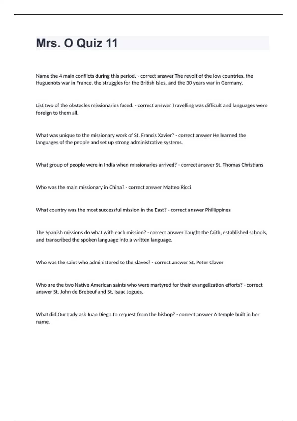 Mrs. O Quiz 11Name the 4 main conflicts during this period. - correct answer The revolt of the low countries, the Huguenots war in France, the struggles for the British Isles, and the 30 years war in Germany. List two of the obstacles missionaries faced. - correct answer Travelling was difficult and languages were foreign to them all. What was unique to the missionary work of St. Francis Xavier? - correct answer He learned the languages of the people and set up strong administrative systems. What group of people were in India when missionaries arrived? - correct answer St. Thomas Christians Who was the main missionary in China? - correct answer Matteo Ricci What country was the most successful mission in the East? - correct answer Phillippines The Spanish missions do what with each mission? - correct answer Taught the faith, established schools, and transcribed the spoken language into a written language. Who was the saint who administered to the slaves? - correct answer St. Peter Claver Who are the two Native American saints who were martyred for their evangelization efforts? - correct answer St. John de Brebeuf and St. Isaac Jogues. What did Our Lady ask Juan Diego to request from the bishop? - correct answer A temple built in her name.