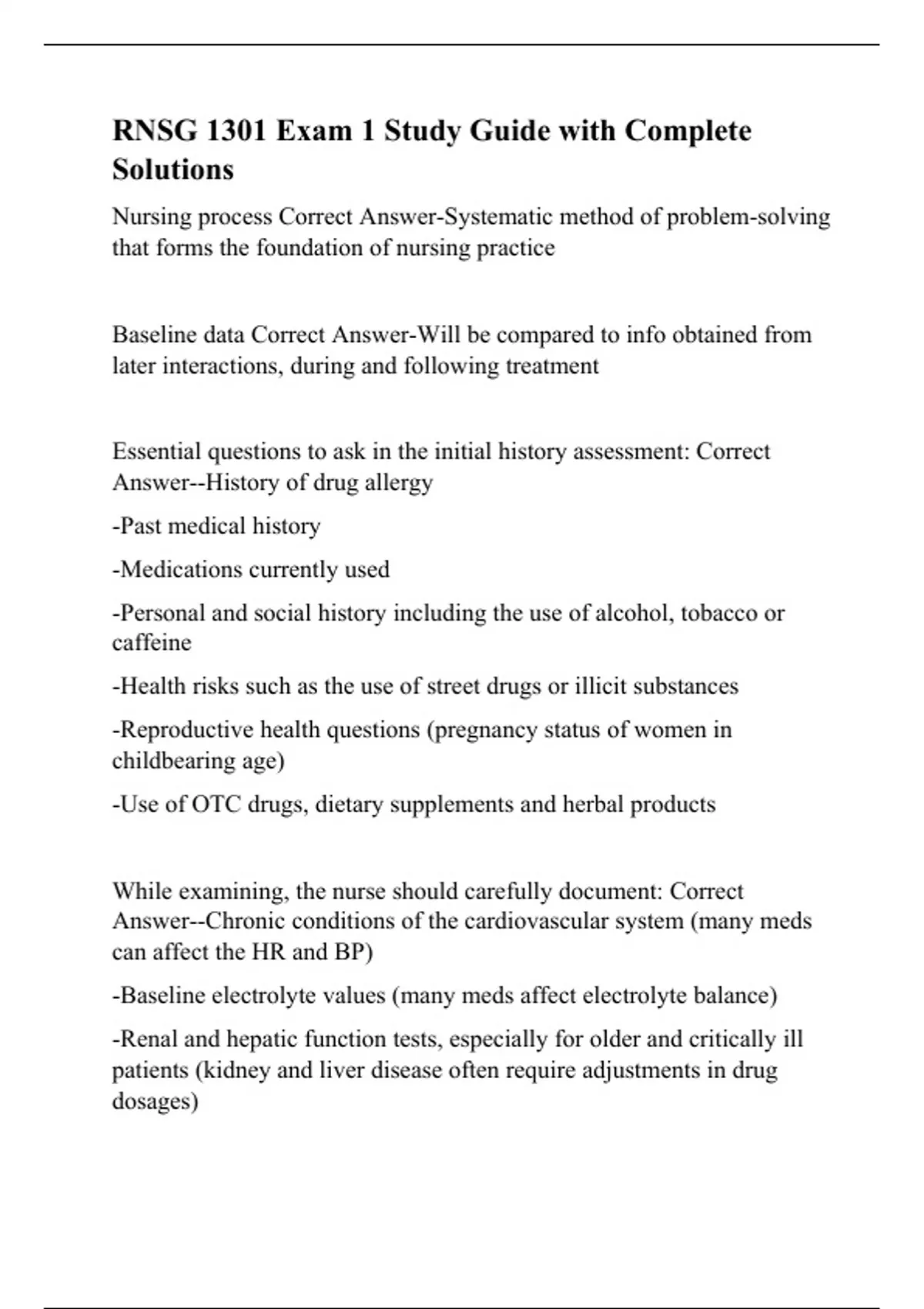 RNSG 1301 Exam 1 Study Guide with Complete Solutions.