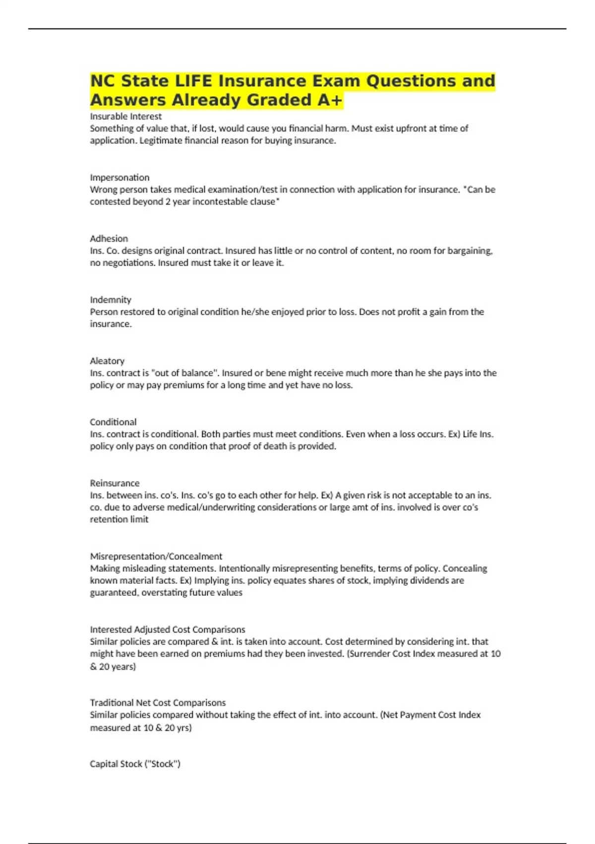NC State LIFE Insurance Exam Questions and Answers Already Graded A+ Insurable Interest Something of value that, if lost, would cause you financial harm. Must exist upfront at time of application. Legitimate financial reason for buying insurance. Impersonation Wrong person takes medical examination/test in connection with application for insurance. *Can be contested beyond 2 year incontestable clause* Adhesion Ins. Co. designs original contract. Insured has little or no control of content, no room for bargaining, no negotiations. Insured must take it or leave it. Indemnity Person restored to original condition he/she enjoyed prior to loss. Does not profit a gain from the insurance. Aleatory Ins. contract is "out of balance". Insured or bene might receive much more than he she pays into the policy or may pay premiums for a long time and yet have no loss. Conditional Ins. contract is conditional. Both parties must meet conditions. Even when a loss occurs. Ex) Life Ins. policy only pays on condition that proof of death is provided. Reinsurance Ins. between ins. co's. Ins. co's go to each other for help. Ex) A given risk is not acceptable to an ins. co. due to adverse medical/underwriting considerations or large amt of ins. involved is over co's retention limit Misrepresentation/Concealment Making misleading statements. Intentionally misrepresenting benefits, terms of policy. Concealing known material facts. Ex) Implying ins. policy equates shares of stock, implying dividends are guaranteed, overstating future values Interested Adjusted Cost Comparisons Similar policies are compared & int. is taken into account. Cost determined by considering int. that might have been earned on premiums had they been invested. (Surrender Cost Index measured at 10 & 20 years) Traditional Net Cost Comparisons Similar policies compared without taking the effect of int. into account. (Net Payment Cost Index measured at 10 & 20 yrs)