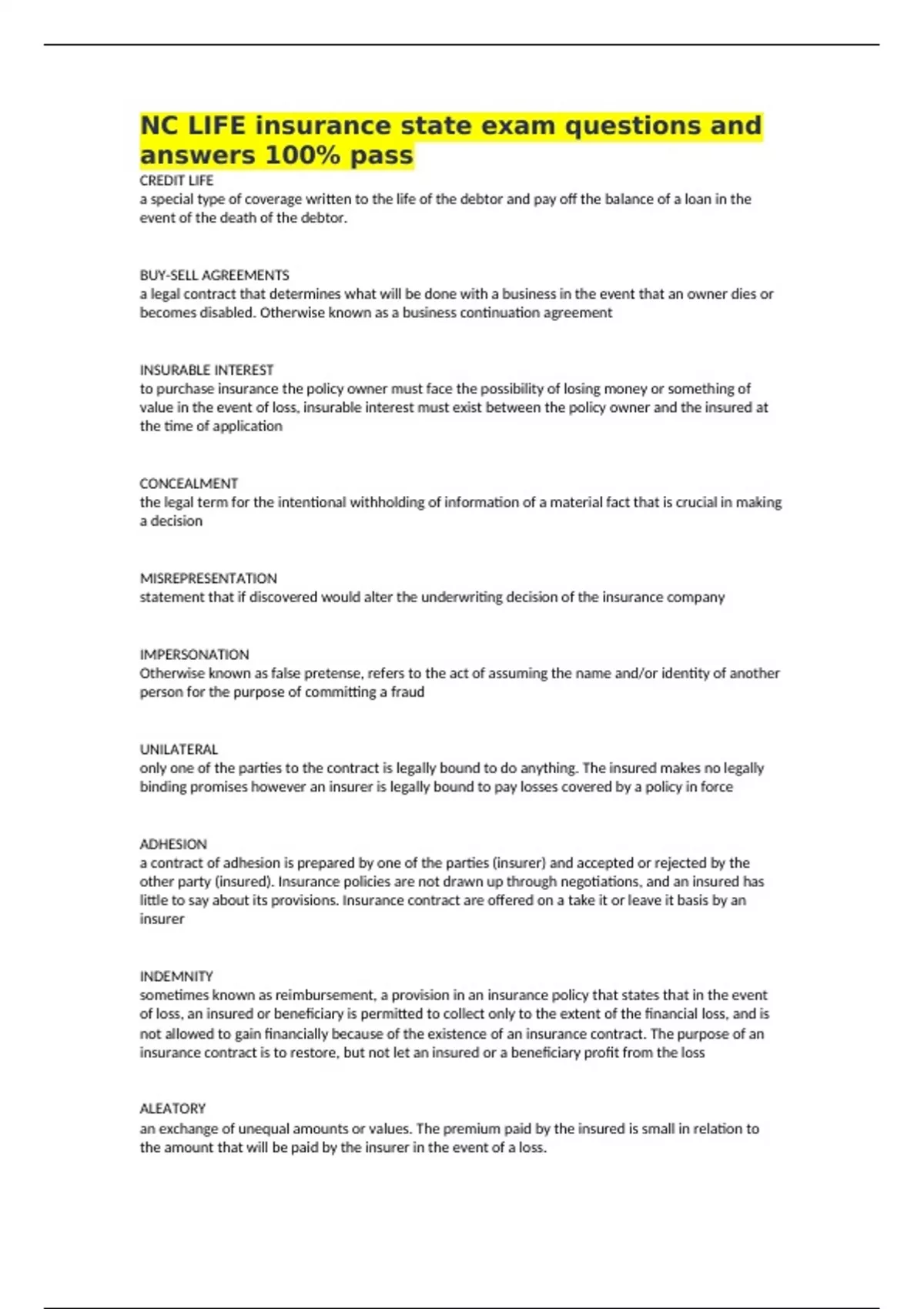 NC LIFE insurance state exam questions and answers 100% pass CREDIT LIFE a special type of coverage written to the life of the debtor and pay off the balance of a loan in the event of the death of the debtor. BUY-SELL AGREEMENTS a legal contract that determines what will be done with a business in the event that an owner dies or becomes disabled. Otherwise known as a business continuation agreement INSURABLE INTEREST to purchase insurance the policy owner must face the possibility of losing money or something of value in the event of loss, insurable interest must exist between the policy owner and the insured at the time of application CONCEALMENT the legal term for the intentional withholding of information of a material fact that is crucial in making a decision MISREPRESENTATION statement that if discovered would alter the underwriting decision of the insurance company IMPERSONATION Otherwise known as false pretense, refers to the act of assuming the name and/or identity of another person for the purpose of committing a fraud UNILATERAL only one of the parties to the contract is legally bound to do anything. The insured makes no legally binding promises however an insurer is legally bound to pay losses covered by a policy in force ADHESION a contract of adhesion is prepared by one of the parties (insurer) and accepted or rejected by the other party (insured). Insurance policies are not drawn up through negotiations, and an insured has little to say about its provisions. Insurance contract are offered on a take it or leave it basis by an insurer INDEMNITY sometimes known as reimbursement, a provision in an insurance policy that states that in the event of loss, an insured or beneficiary is permitted to collect only to the extent of the financial loss, and is not allowed to gain financially because of the existence of an insurance contract. The purpose of an insurance contract is to restore, but not let an insured or a beneficiary profit from the loss ALEATORY an exchange of unequal amounts or values. The premium paid by the insured is small in relation to the amount that will be paid by the insurer in the event of a loss.